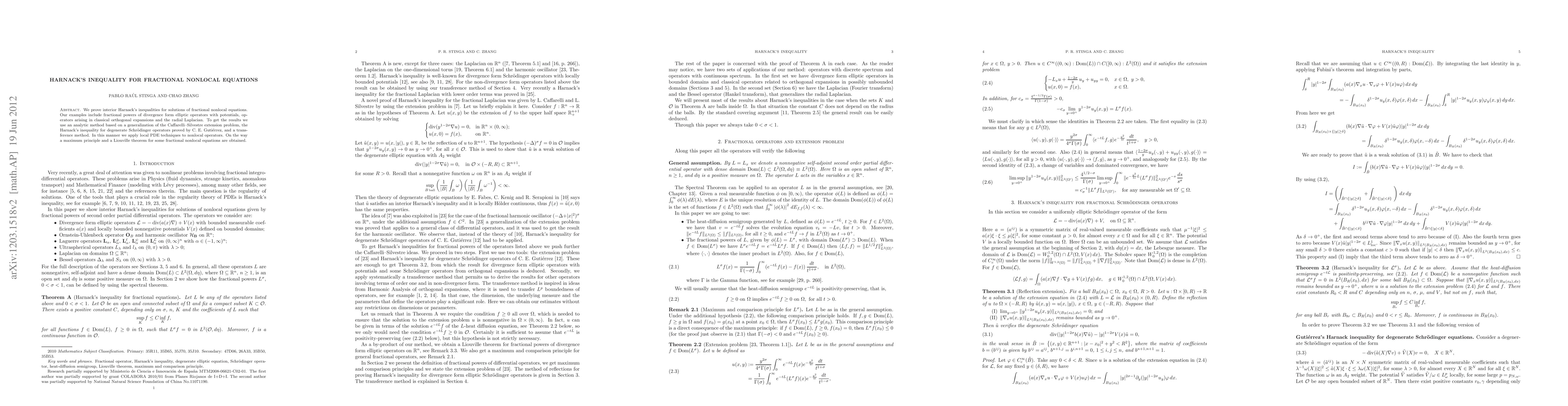 This paper proves interior Harnack's inequalities for solutions of fractional nonlocal equations using an analytic method based on Caffarelli-Silvestre extensions and local PDE techniques. It also establishes a maximum principle and a Liouville theorem for certain fractional nonlocal equations.