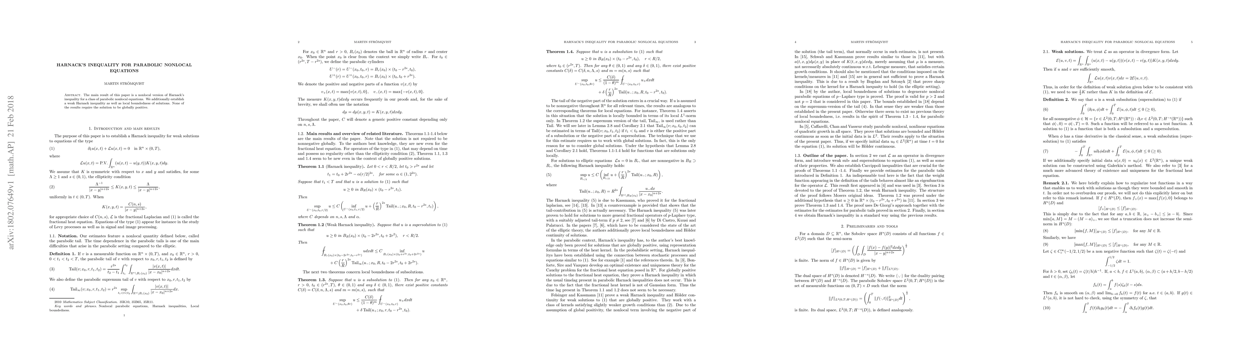 This paper establishes a nonlocal version of Harnack's inequality for a class of parabolic nonlocal equations, along with a weak Harnack inequality and local boundedness of solutions, without requiring global positivity of the solutions.
