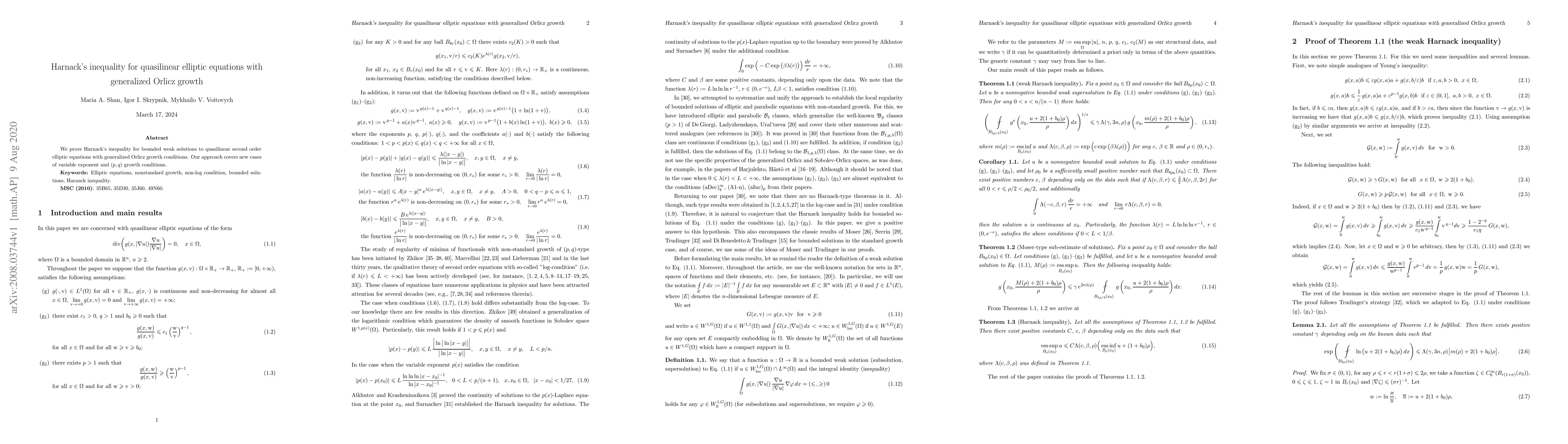 Summary: This paper proves Harnack's inequality for quasilinear elliptic equations with generalized Orlicz growth conditions, addressing new cases of variable exponent and (p,q) growth conditions. The method covers a broader range of variable exponent scenarios.