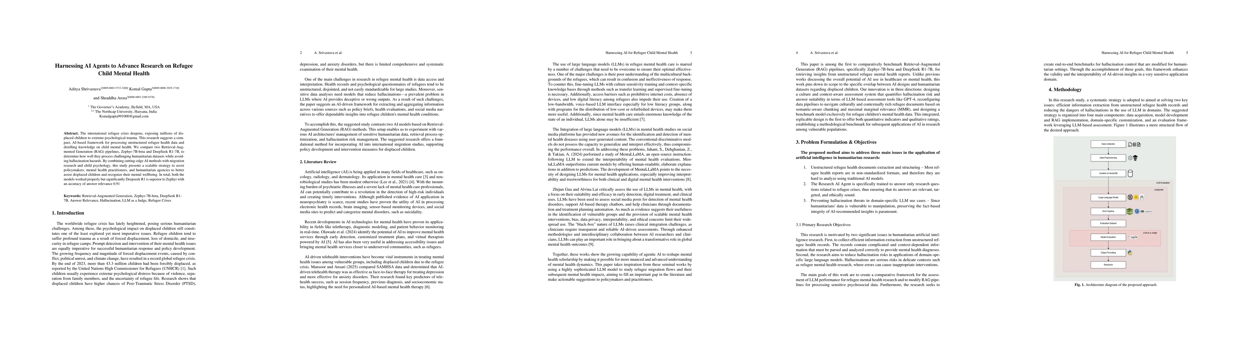 The international refugee crisis deepens, exposing millions of dis placed children to extreme psychological trauma. This research suggests a com pact, AI-based framework for processing unstructured refugee health data and distilling knowledge on child mental health. We compare two Retrieval-Aug mented Generation (RAG) pipelines, Zephyr-7B-beta and DeepSeek R1-7B, to determine how well they process challenging humanitarian datasets while avoid ing hallucination hazards. By combining cutting-edge AI methods with migration research and child psychology, this study presents a scalable strategy to assist policymakers, mental health practitioners, and humanitarian agencies to better assist displaced children and recognize their mental wellbeing. In total, both the models worked properly but significantly Deepseek R1 is superior to Zephyr with an accuracy of answer relevance 0.91