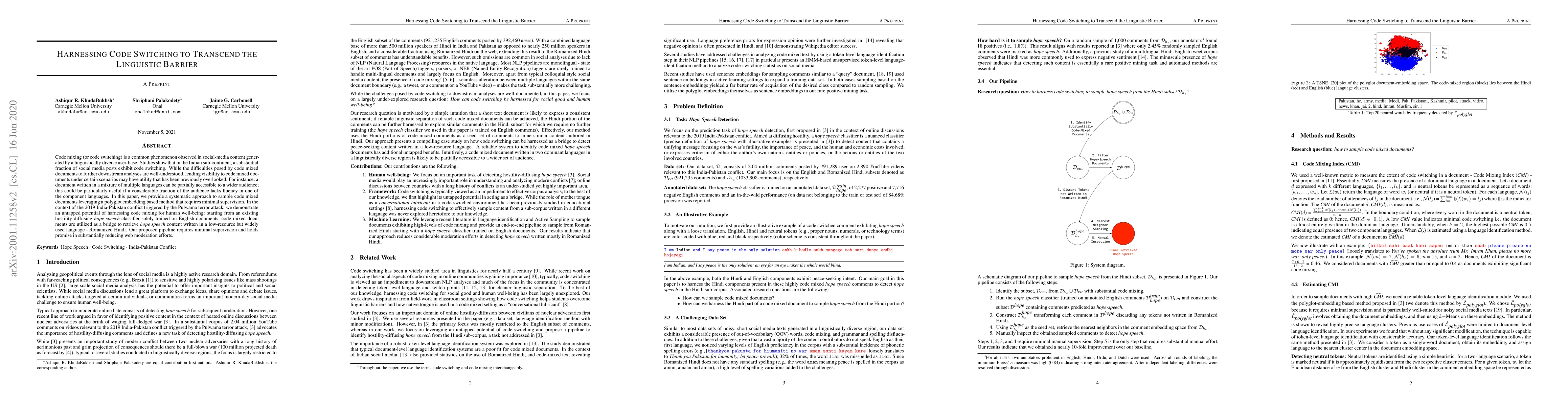 Code mixing (or code switching) is a common phenomenon observed in social-media content generated by a linguistically diverse user-base. Studies show that in the Indian sub-continent, a substantial fraction of social media posts exhibit code switching. While the difficulties posed by code mixed documents to further downstream analyses are well-understood, lending visibility to code mixed documents under certain scenarios may have utility that has been previously overlooked. For instance, a document written in a mixture of multiple languages can be partially accessible to a wider audience; this could be particularly useful if a considerable fraction of the audience lacks fluency in one of the component languages. In this paper, we provide a systematic approach to sample code mixed documents leveraging a polyglot embedding based method that requires minimal supervision. In the context of the 2019 India-Pakistan conflict triggered by the Pulwama terror attack, we demonstrate an untapped potential of harnessing code mixing for human well-being: starting from an existing hostility diffusing \emph{hope speech} classifier solely trained on English documents, code mixed documents are utilized as a bridge to retrieve \emph{hope speech} content written in a low-resource but widely used language - Romanized Hindi. Our proposed pipeline requires minimal supervision and holds promise in substantially reducing web moderation efforts.