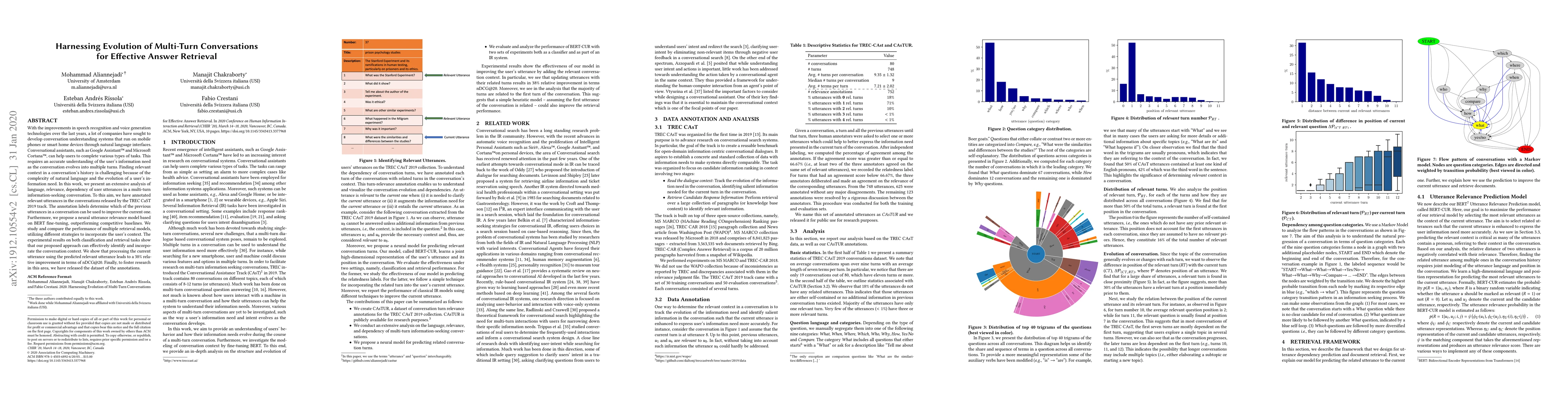 With the improvements in speech recognition and voice generation technologies over the last years, a lot of companies have sought to develop conversation understanding systems that run on mobile phones or smart home devices through natural language interfaces. Conversational assistants, such as Google Assistant and Microsoft Cortana, can help users to complete various types of tasks. This requires an accurate understanding of the user's information need as the conversation evolves into multiple turns. Finding relevant context in a conversation's history is challenging because of the complexity of natural language and the evolution of a user's information need. In this work, we present an extensive analysis of language, relevance, dependency of user utterances in a multi-turn information-seeking conversation. To this aim, we have annotated relevant utterances in the conversations released by the TREC CaST 2019 track. The annotation labels determine which of the previous utterances in a conversation can be used to improve the current one. Furthermore, we propose a neural utterance relevance model based on BERT fine-tuning, outperforming competitive baselines. We study and compare the performance of multiple retrieval models, utilizing different strategies to incorporate the user's context. The experimental results on both classification and retrieval tasks show that our proposed approach can effectively identify and incorporate the conversation context. We show that processing the current utterance using the predicted relevant utterance leads to a 38% relative improvement in terms of nDCG@20. Finally, to foster research in this area, we have released the dataset of the annotations.