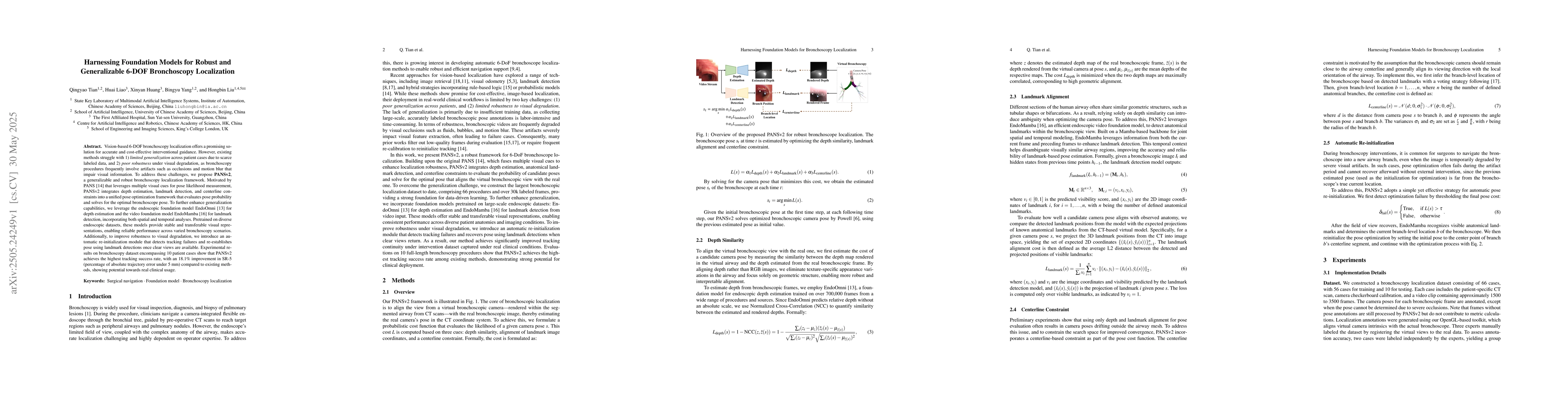 The research proposes PANSv2, a 6-DOF bronchoscopy localization framework that integrates depth estimation, landmark detection, and centerline constraints into a unified pose optimization framework. It leverages foundation models EndoOmni for depth estimation and EndoMamba for landmark detection, enhancing generalization and robustness.