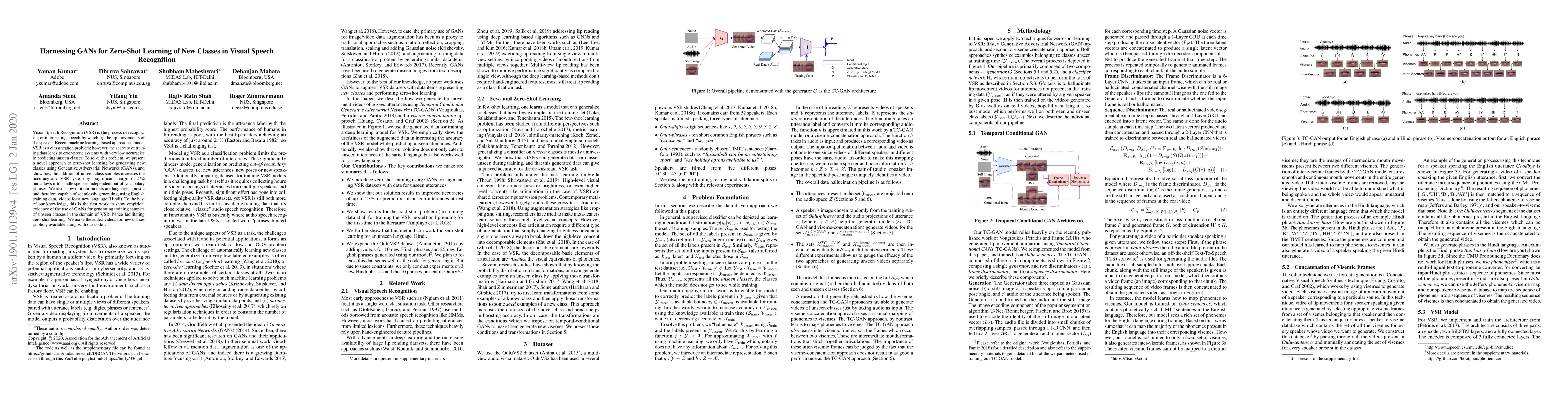 Visual Speech Recognition (VSR) is the process of recognizing or interpreting speech by watching the lip movements of the speaker. Recent machine learning based approaches model VSR as a classification problem; however, the scarcity of training data leads to error-prone systems with very low accuracies in predicting unseen classes. To solve this problem, we present a novel approach to zero-shot learning by generating new classes using Generative Adversarial Networks (GANs), and show how the addition of unseen class samples increases the accuracy of a VSR system by a significant margin of 27% and allows it to handle speaker-independent out-of-vocabulary phrases. We also show that our models are language agnostic and therefore capable of seamlessly generating, using English training data, videos for a new language (Hindi). To the best of our knowledge, this is the first work to show empirical evidence of the use of GANs for generating training samples of unseen classes in the domain of VSR, hence facilitating zero-shot learning. We make the added videos for new classes publicly available along with our code.