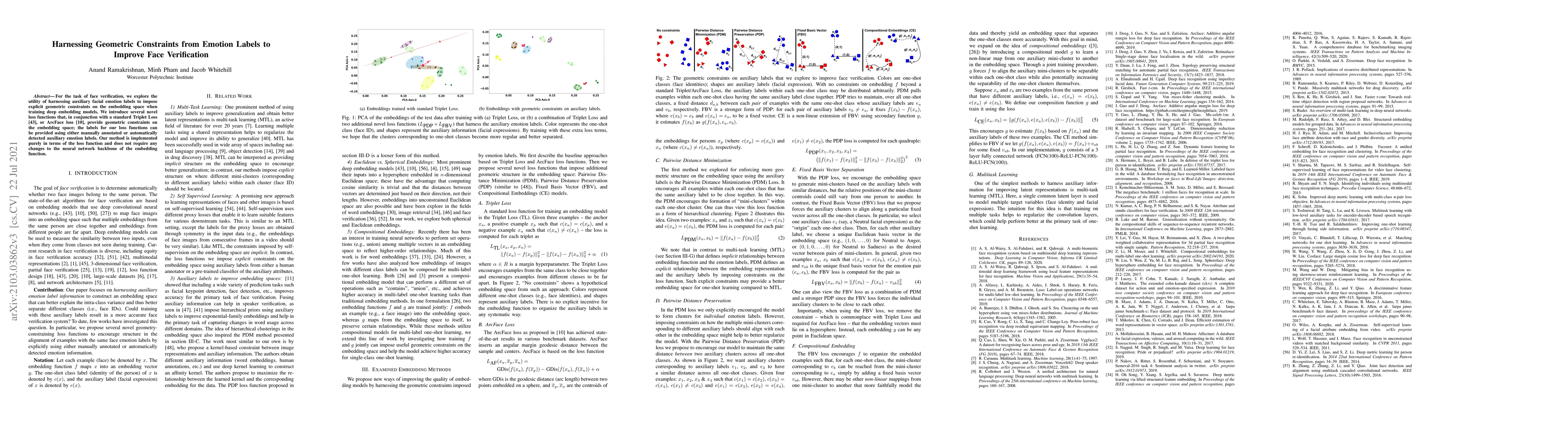 For the task of face verification, we explore the utility of harnessing auxiliary facial emotion labels to impose explicit geometric constraints on the embedding space when training deep embedding models. We introduce several novel loss functions that, in conjunction with a standard Triplet Loss [43], or ArcFace loss [10], provide geometric constraints on the embedding space; the labels for our loss functions can be provided using either manually annotated or automatically detected auxiliary emotion labels. Our method is implemented purely in terms of the loss function and does not require any changes to the neural network backbone of the embedding function.