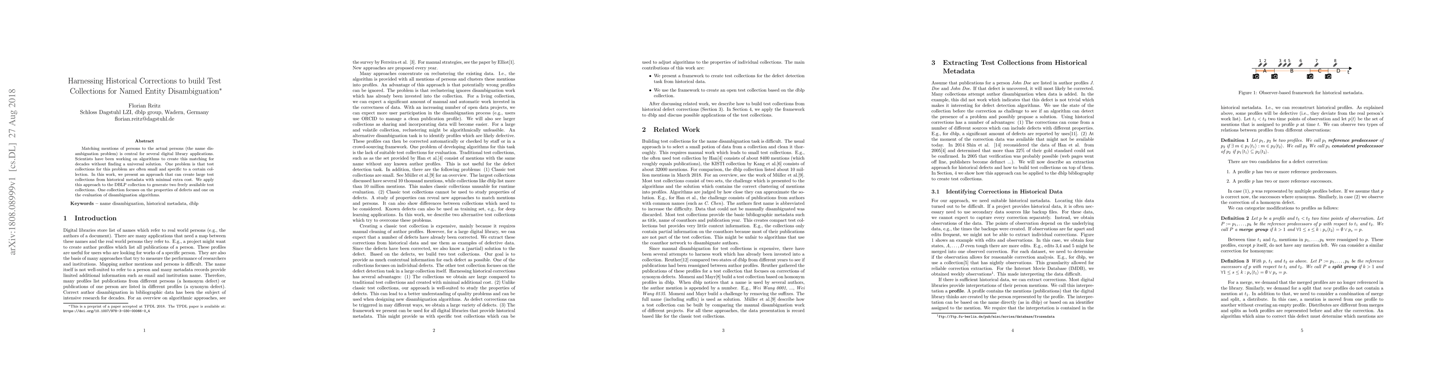 Matching mentions of persons to the actual persons (the name disambiguation problem) is central for several digital library applications. Scientists have been working on algorithms to create this matching for decades without finding a universal solution. One problem is that test collections for this problem are often small and specific to a certain collection. In this work, we present an approach that can create large test collections from historical metadata with minimal extra cost. We apply this approach to the DBLP collection to generate two freely available test collections. One collection focuses on the properties of defects and one on the evaluation of disambiguation algorithms.