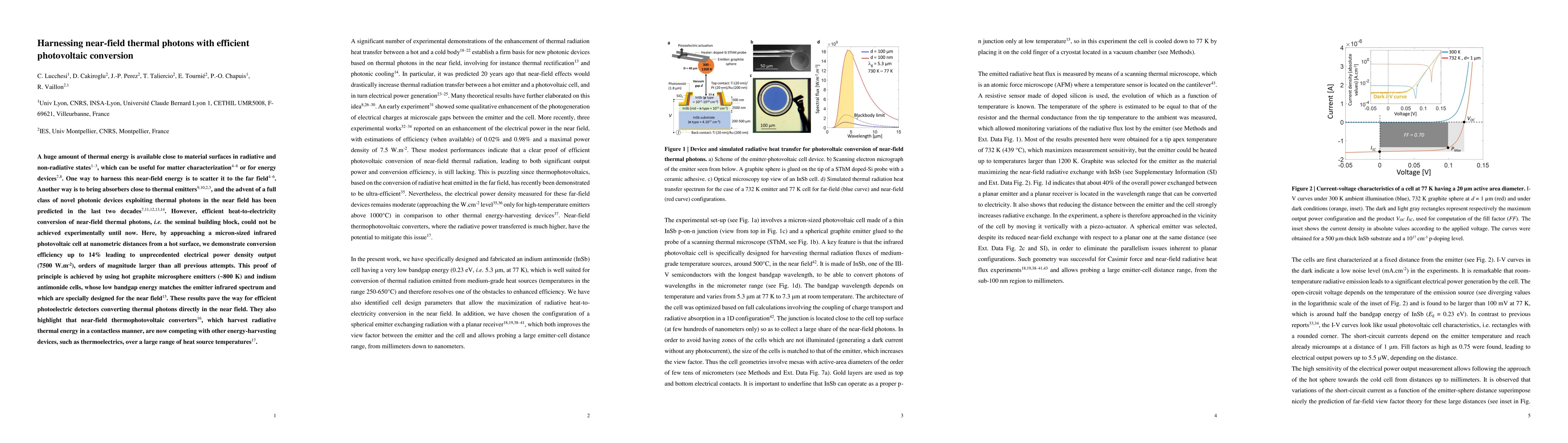 This paper demonstrates a significant breakthrough in converting near-field thermal photons into electricity via photovoltaic means, achieving a conversion efficiency of up to 14% and an unprecedented electrical power density of 7500 W/m². The success is attributed to specially designed infrared photovoltaic cells positioned at nanometric distances from hot graphite microsphere emitters.