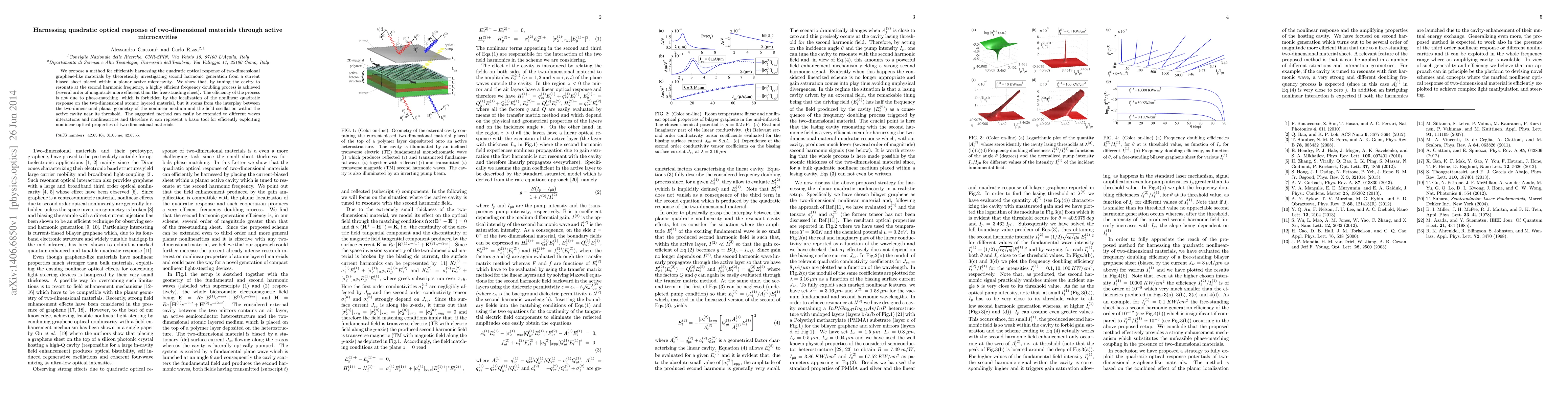 We propose a method for efficiently harnessing the quadratic optical response of two-dimensional graphene-like materials by theoretically investigating second harmonic generation from a current biased sheet placed within a planar active microcavity. We show that, by tuning the cavity to resonate at the second harmonic frequency, a highly efficient frequency doubling process is achieved (several order of magnitude more efficient than the free-standing sheet). The efficiency of the process is not due to phase-matching, which is forbidden by the localization of the nonlinear quadratic response on the two-dimensional atomic layered material, but it stems from the interplay between the two-dimensional planar geometry of the nonlinear medium and the field oscillation within the active cavity near its threshold. The suggested method can easily be extended to different waves interactions and nonlinearities and therefore it can represent a basic tool for efficiently exploiting nonlinear optical properties of two-dimensional materials.