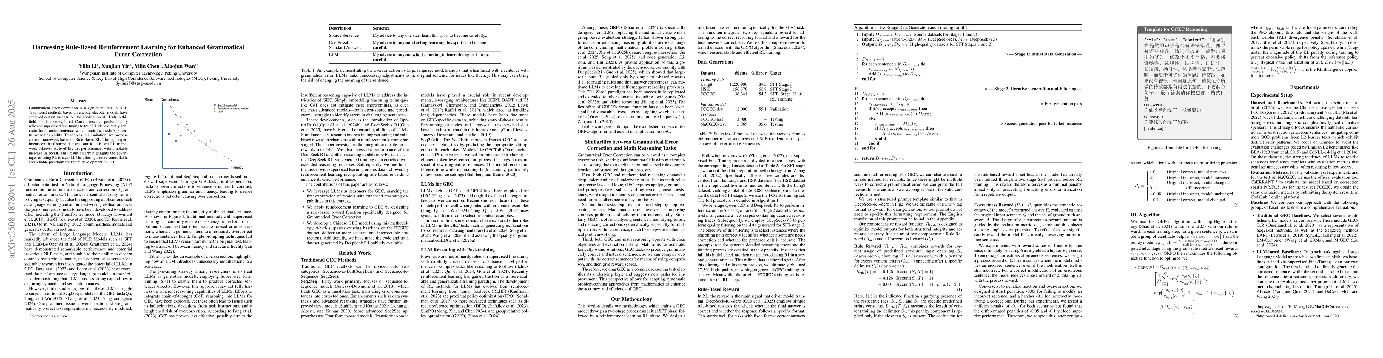 Grammatical error correction is a significant task in NLP. Traditional methods based on encoder-decoder models have achieved certain success, but the application of LLMs in this field is still underexplored. Current research predominantly relies on supervised fine-tuning to train LLMs to directly generate the corrected sentence, which limits the model's powerful reasoning ability. To address this limitation, we propose a novel framework based on Rule-Based RL. Through experiments on the Chinese datasets, our Rule-Based RL framework achieves \textbf{state-of-the-art }performance, with a notable increase in \textbf{recall}. This result clearly highlights the advantages of using RL to steer LLMs, offering a more controllable and reliable paradigm for future development in GEC.