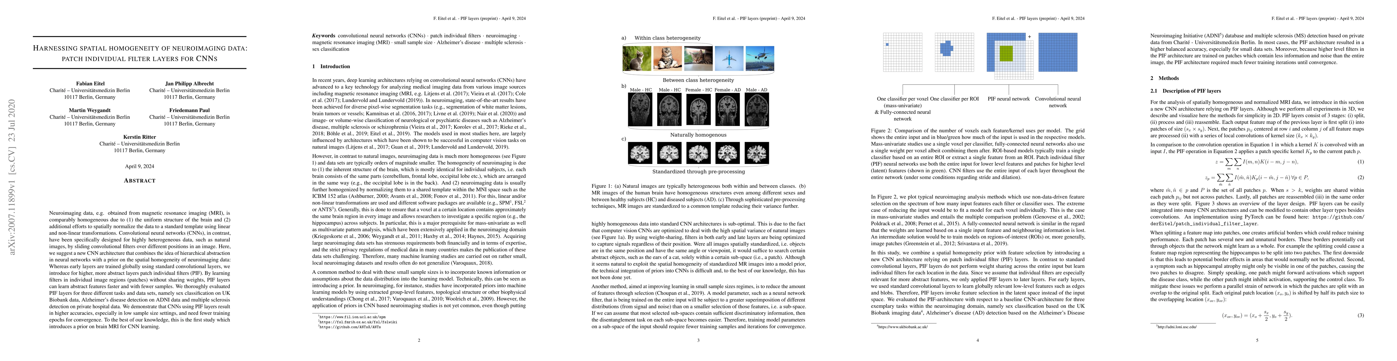 This paper proposes a novel CNN architecture that leverages the spatial homogeneity of neuroimaging data by introducing patch individual filter (PIF) layers for higher abstraction. PIF layers learn filters in individual image patches without weight sharing, leading to faster learning and higher accuracy, especially with limited samples. The method is evaluated on sex classification, Alzheimer's disease detection, and multiple sclerosis detection, showing improved performance compared to standard CNNs.