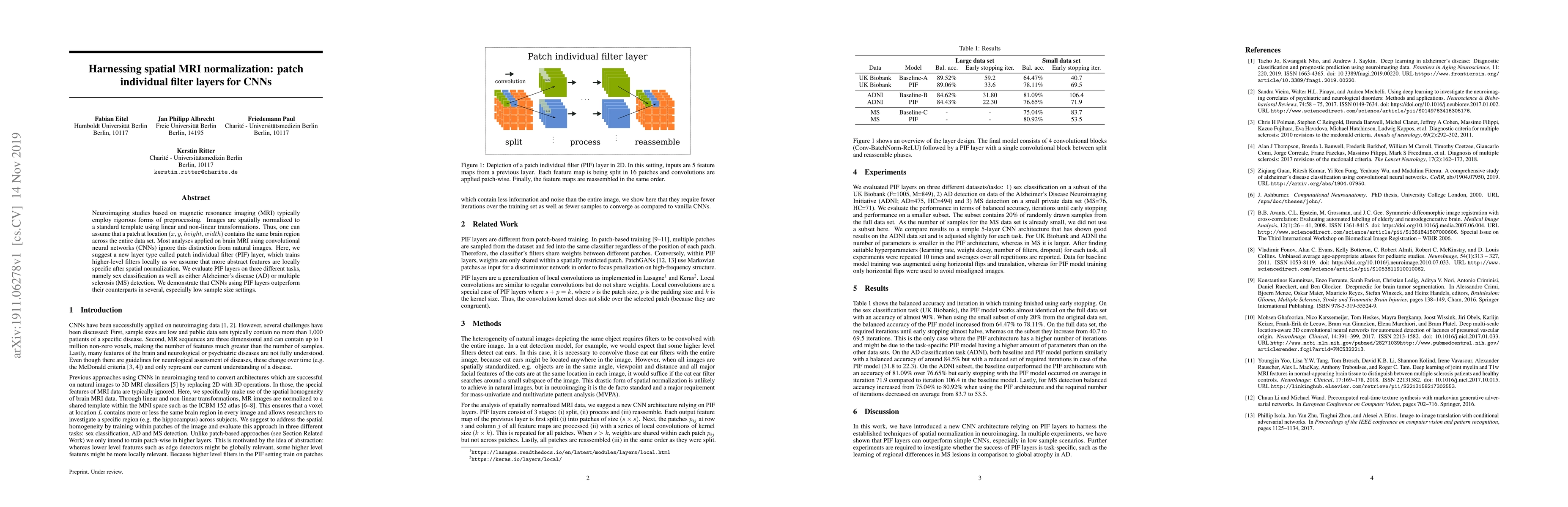 This paper proposes a patch individual filter (PIF) layer for convolutional neural networks to better handle spatially normalized MRI data, assuming locally specific features post-normalization. The PIF layer trains higher-level filters locally, leading to improved performance in tasks like sex classification and disease detection (Alzheimer's or multiple sclerosis) compared to standard CNNs, especially with limited samples.