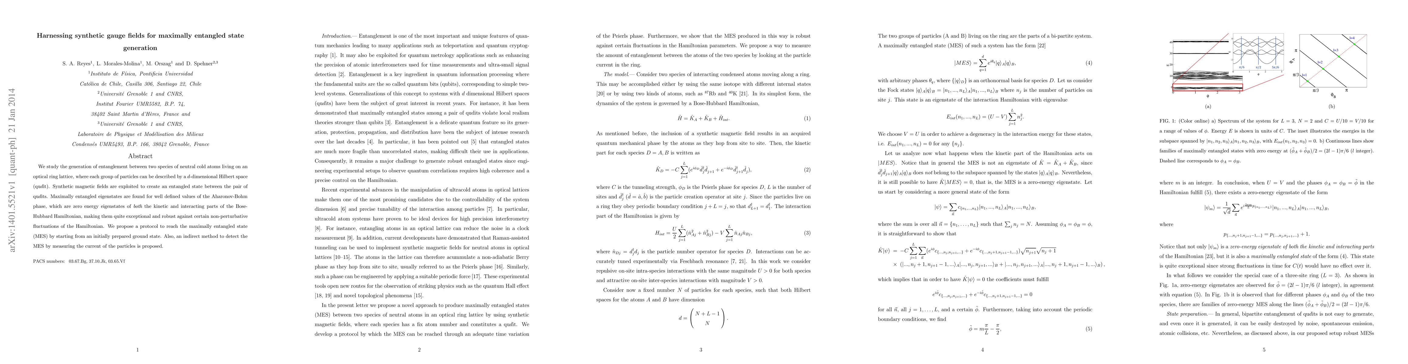 This research explores the generation of maximally entangled states between two groups of neutral cold atoms on an optical ring lattice using synthetic magnetic fields. It identifies specific Aharonov-Bohm phase values that create robust, zero-energy eigenstates, and proposes protocols for preparing and detecting these maximally entangled states.