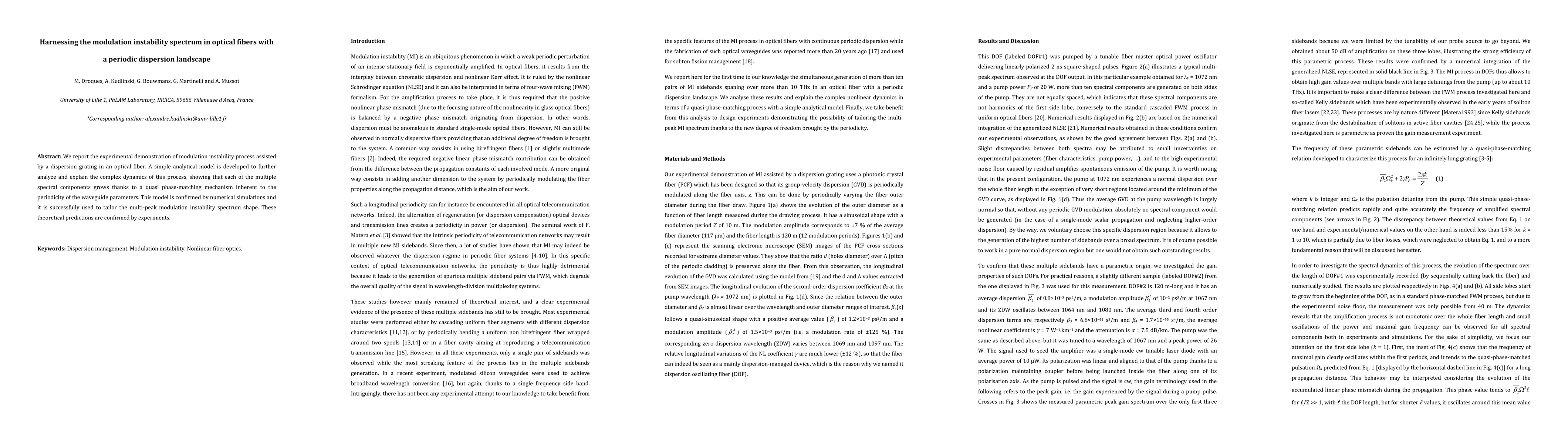 This paper demonstrates modulation instability in optical fibers enhanced by a dispersion grating, using an analytical model to explain the quasi phase-matching mechanism. Numerical simulations and experiments confirm the model's ability to shape the modulation instability spectrum.