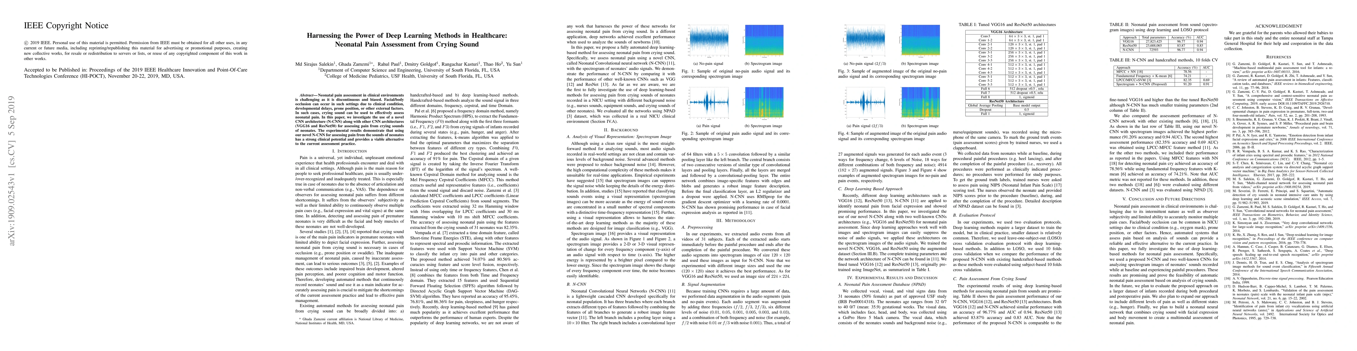 This paper explores the use of deep learning methods, specifically CNN architectures including N-CNN, VGG16, and ResNet50, to assess neonatal pain from crying sounds. The novel N-CNN shows strong clinical potential, offering a promising alternative to traditional pain assessment methods.
