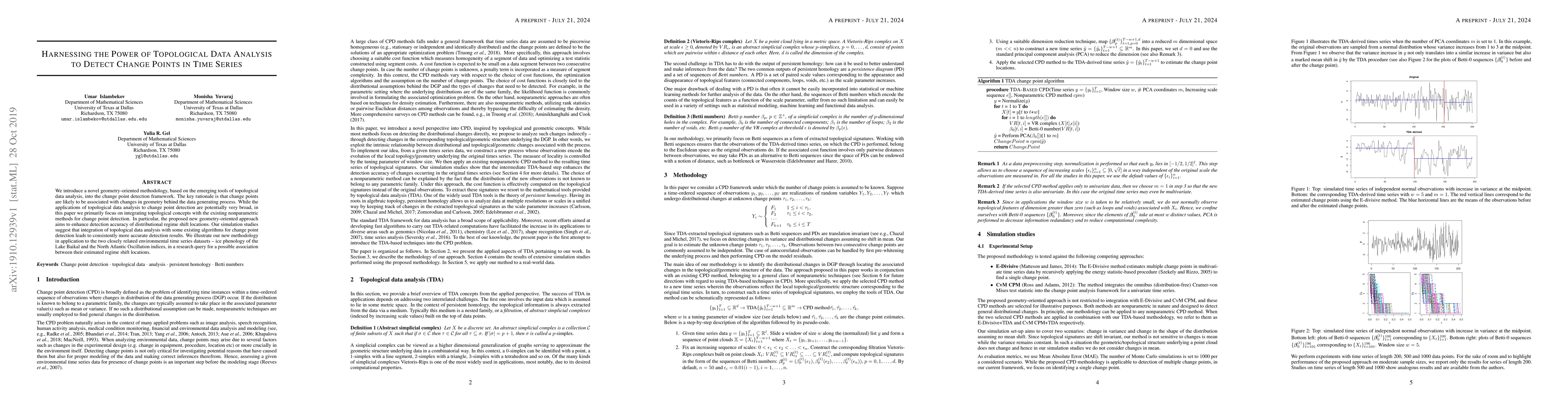 We introduce a novel geometry-oriented methodology, based on the emerging tools of topological data analysis, into the change point detection framework. The key rationale is that change points are likely to be associated with changes in geometry behind the data generating process. While the applications of topological data analysis to change point detection are potentially very broad, in this paper we primarily focus on integrating topological concepts with the existing nonparametric methods for change point detection. In particular, the proposed new geometry-oriented approach aims to enhance detection accuracy of distributional regime shift locations. Our simulation studies suggest that integration of topological data analysis with some existing algorithms for change point detection leads to consistently more accurate detection results. We illustrate our new methodology in application to the two closely related environmental time series datasets -ice phenology of the Lake Baikal and the North Atlantic Oscillation indices, in a research query for a possible association between their estimated regime shift locations.