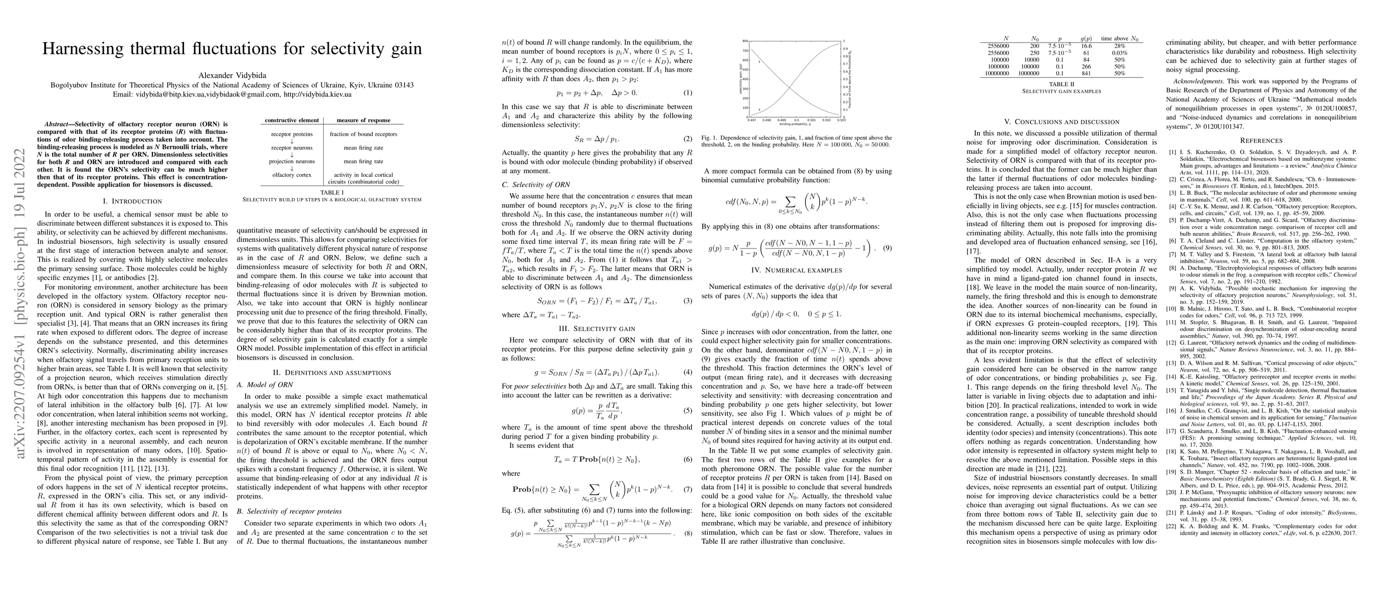 Selectivity of olfactory receptor neuron (ORN) is compared with that of its receptor proteins (R) with fluctuations of odor binding-releasing process taken into account. The binding-releasing process is modeled as N Bernoulli trials, where N is the total number of R per ORN. Dimensionless selectivities for both R and ORN are introduced and compared with each other. It is found the ORN's selectivity can be much higher then that of its receptor proteins. This effect is concentration-dependent. Possible application for biosensors is discussed. URL: https://ieeexplore.ieee.org/stamp/stamp.jsp?tp=&arnumber=9789678&isnumber=9789552