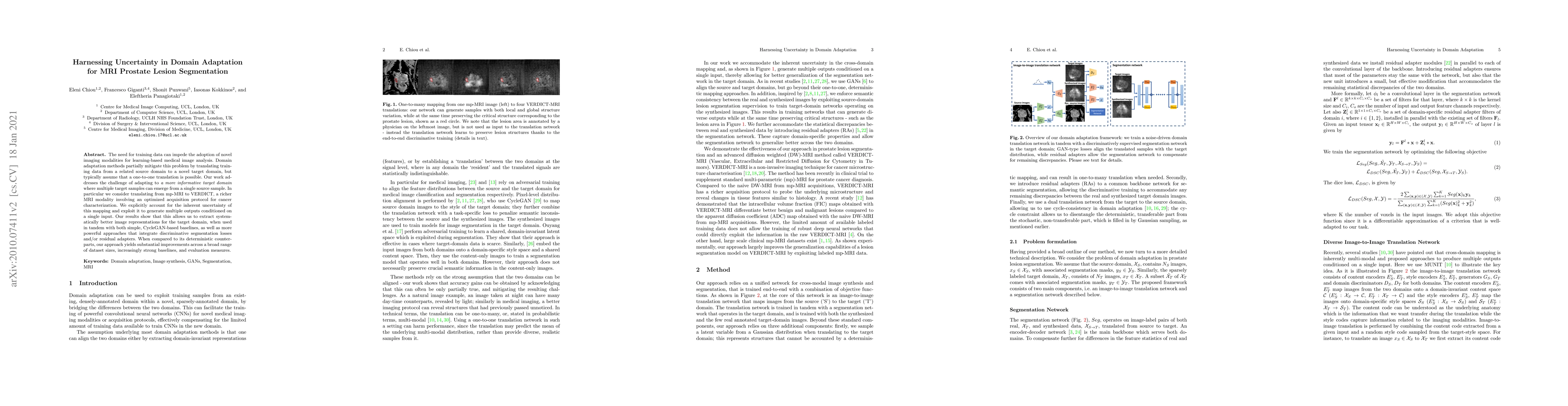 The need for training data can impede the adoption of novel imaging modalities for learning-based medical image analysis. Domain adaptation methods partially mitigate this problem by translating training data from a related source domain to a novel target domain, but typically assume that a one-to-one translation is possible. Our work addresses the challenge of adapting to a more informative target domain where multiple target samples can emerge from a single source sample. In particular we consider translating from mp-MRI to VERDICT, a richer MRI modality involving an optimized acquisition protocol for cancer characterization. We explicitly account for the inherent uncertainty of this mapping and exploit it to generate multiple outputs conditioned on a single input. Our results show that this allows us to extract systematically better image representations for the target domain, when used in tandem with both simple, CycleGAN-based baselines, as well as more powerful approaches that integrate discriminative segmentation losses and/or residual adapters. When compared to its deterministic counterparts, our approach yields substantial improvements across a broad range of dataset sizes, increasingly strong baselines, and evaluation measures.