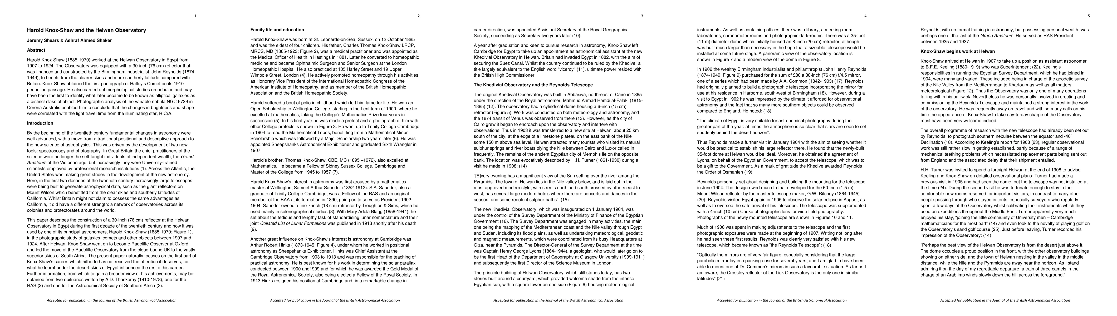 Harold Knox-Shaw (1885-1970) worked at the Helwan Observatory in Egypt from 1907 to 1924. The Observatory was equipped with a 30-inch (76 cm) reflector that was financed and constructed by the Birmingham industrialist, John Reynolds (1874-1949), to benefit from the clearer skies and more southerly latitude compared with Britain. Knox-Shaw obtained the first photograph of Halley's Comet on its 1910 perihelion passage. He also carried out morphological studies on nebulae and may have been the first to identify what later became to be known as elliptical galaxies as a distinct class of object. Photographic analysis of the variable nebula NGC 6729 in Corona Australis enabled him to conclude that the changes in brightness and shape were correlated with the light travel time from the illuminating star, R CrA.