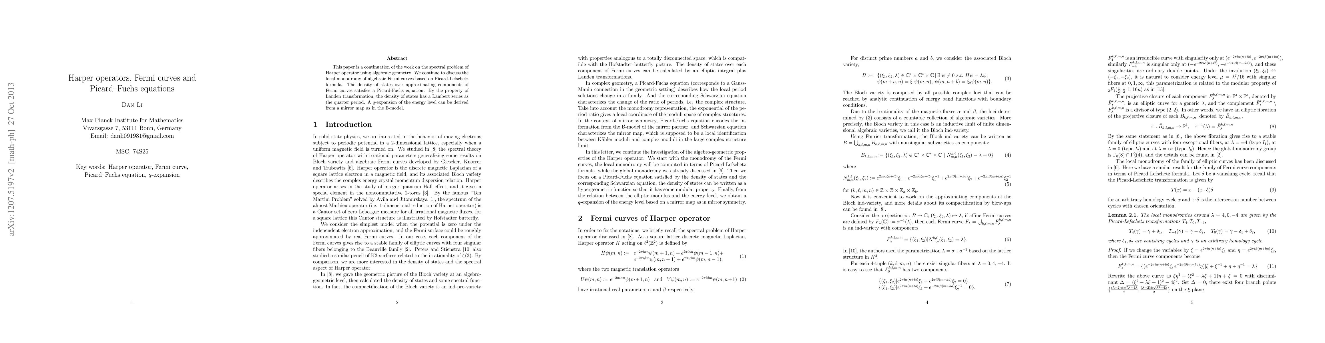 This paper is a continuation of the work on the spectral problem of Harper operator using algebraic geometry. We continue to discuss the local monodromy of algebraic Fermi curves based on Picard-Lefschetz formula. The density of states over approximating components of Fermi curves satisfies a Picard-Fuchs equation. By the property of Landen transformation, the density of states has a Lambert series as the quarter period. A $q$-expansion of the energy level can be derived from a mirror map as in the B-model.