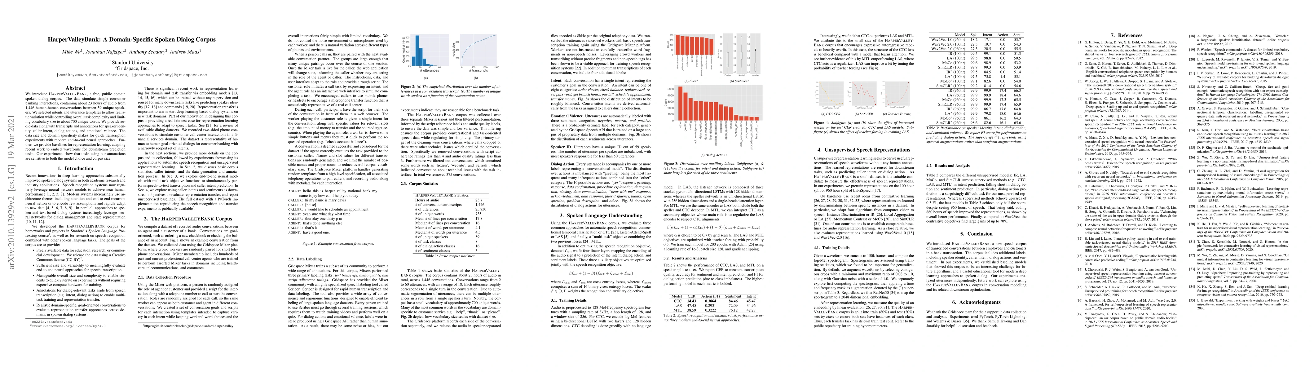 A new spoken dialog corpus called HarperValleyBank is introduced, offering 23 hours of audio from 1,446 conversations for quick testing of modern end-to-end neural approaches.