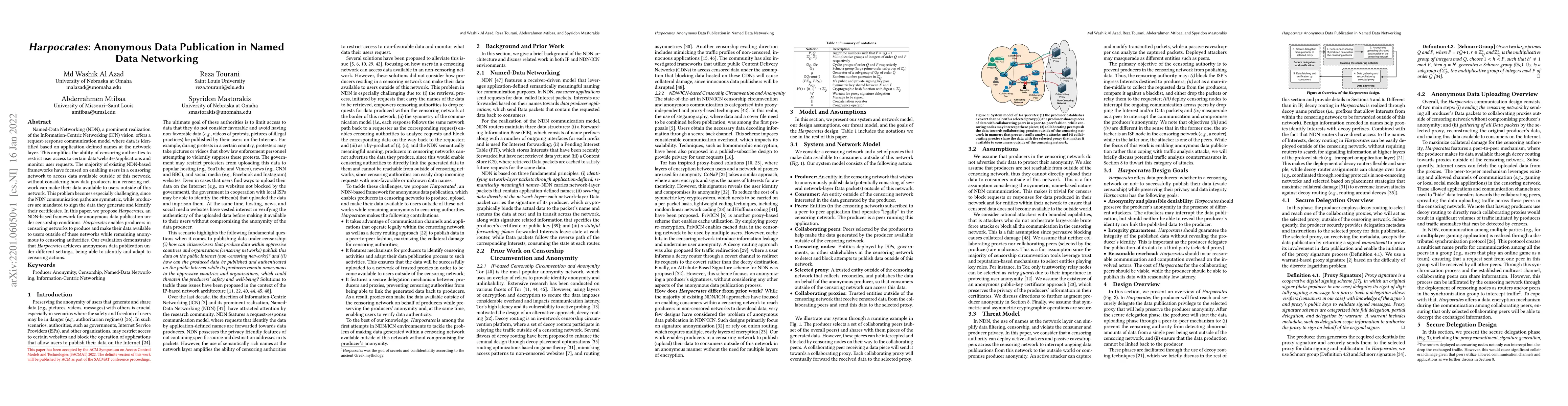 Harpocrates is an anonymous data publication framework for Named-Data Networking (NDN) that allows data producers in censoring networks to publish data anonymously to users outside the network. The evaluation shows Harpocrates can adapt to and identify censoring actions.