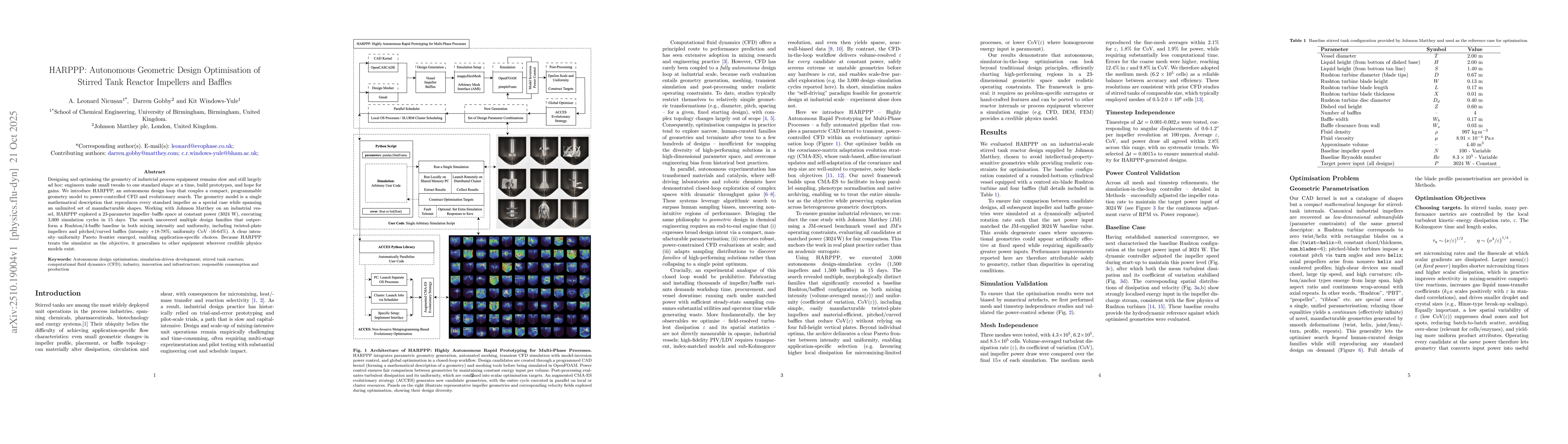 Designing and optimising the geometry of industrial process equipment remains slow and still largely ad hoc: engineers make small tweaks to one standard shape at a time, build prototypes, and hope for gains. We introduce HARPPP, an autonomous design loop that couples a compact, programmable geometry model to power-controlled CFD and evolutionary search. The geometry model is a single mathematical description that reproduces every standard impeller as a special case while spanning an unlimited set of manufacturable shapes. Working with Johnson Matthey on an industrial vessel, HARPPP explored a 23-parameter impeller-baffle space at constant power (3024 W), executing 3,000 simulation cycles in 15 days. The search uncovered multiple design families that outperform a Rushton/4-baffle baseline in both mixing intensity and uniformity, including twisted-plate impellers and pitched/curved baffles (intensity +18 to +78 percent; uniformity CoV -16 to -64 percent). A clear intensity-uniformity Pareto frontier emerged, enabling application-specific choices. Because HARPPP treats the simulator as the objective, it generalises to other equipment wherever credible physics models exist.