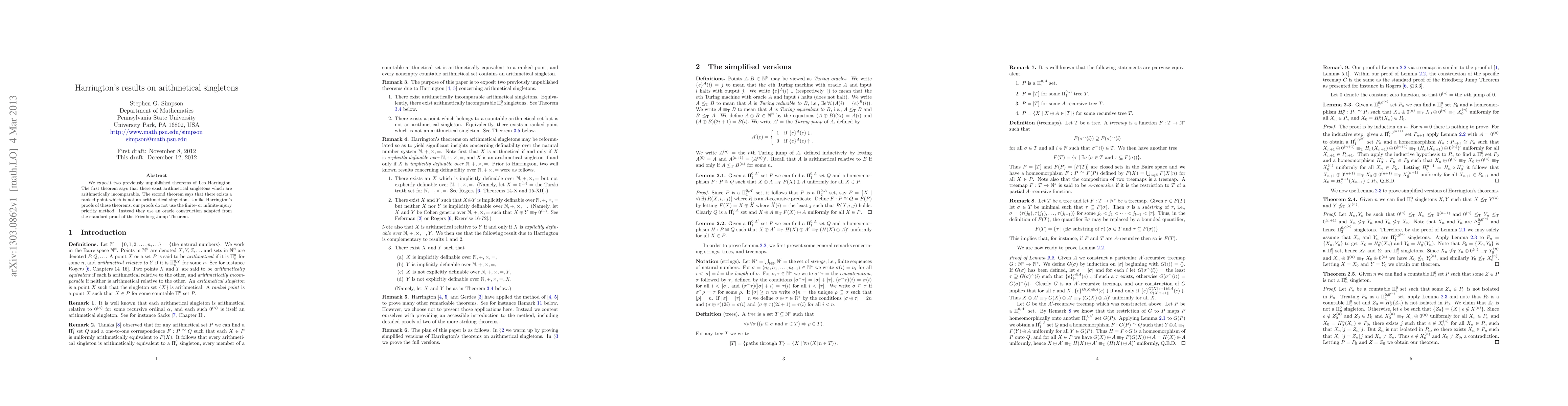 We exposit two previously unpublished theorems of Leo Harrington. The first theorem says that there exist arithmetical singletons which are arithmetically incomparable. The second theorem says that there exists a ranked point which is not an arithmetical singleton. Unlike Harrington's proofs of these theorems, our proofs do not use the finite- or infinite-injury priority method. Instead they use an oracle construction adapted from the standard proof of the Friedberg Jump Theorem.