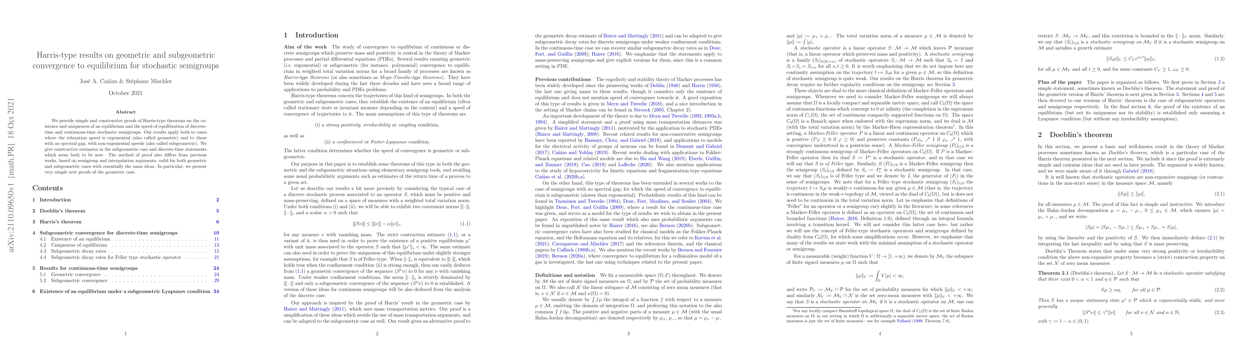 We provide simple and constructive proofs of Harris-type theorems on the existence and uniqueness of an equilibrium and the speed of equilibration of discrete-time and continuous-time stochastic semigroups. Our results apply both to cases where the relaxation speed is exponential (also called geometric) and to those with no spectral gap, with non-exponential speeds (also called subgeometric). We give constructive estimates in the subgeometric case and discrete-time statements which seem both to be new. The method of proof also differs from previous works, based on semigroup and interpolation arguments, valid for both geometric and subgeometric cases with essentially the same ideas. In particular, we present very simple new proofs of the geometric case.