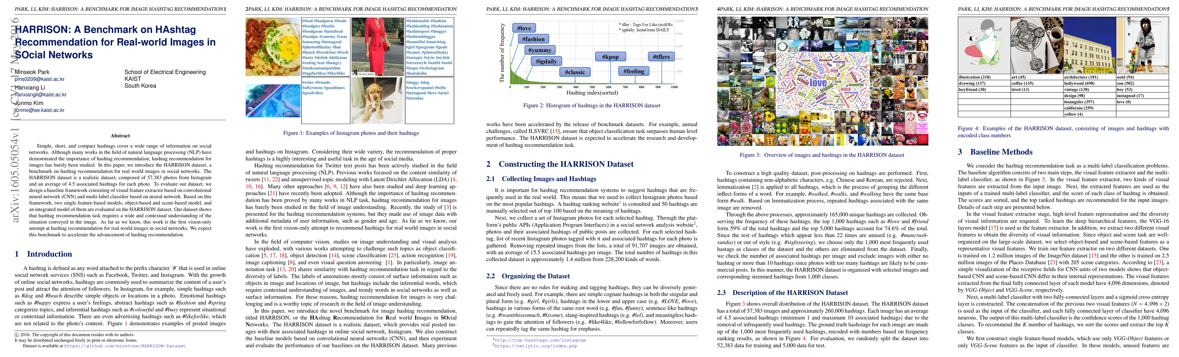 The HARRISON dataset introduces a benchmark for hashtag recommendation on real-world images from Instagram, featuring 57,383 photos with an average of 4.5 hashtags each. The study evaluates visual feature-based models for this task, aiming to advance the field of vision-only hashtag recommendation in social networks.