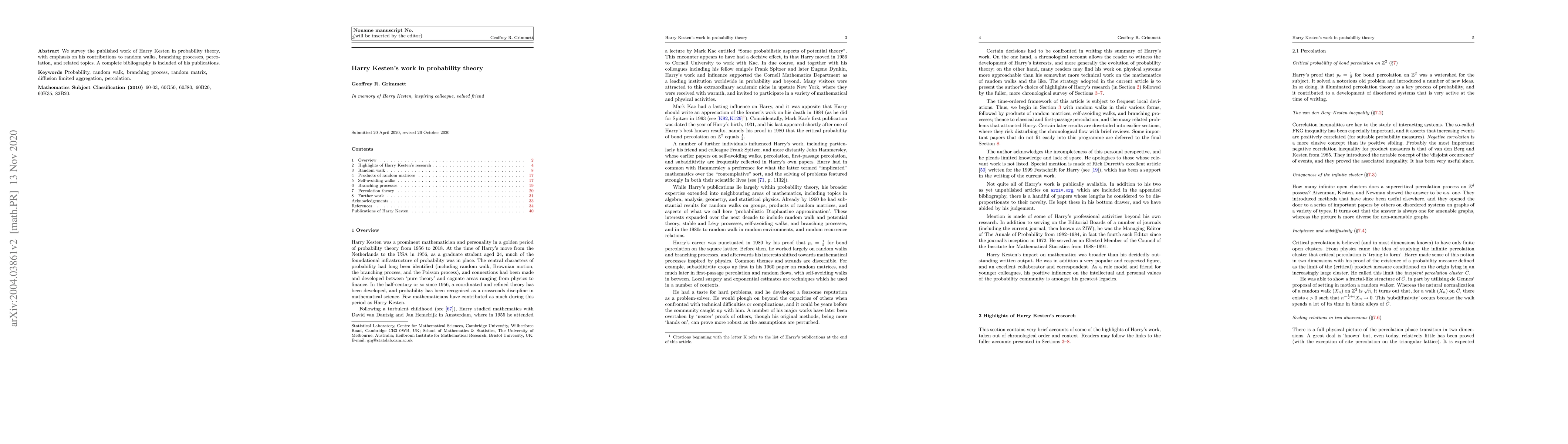 We survey the published work of Harry Kesten in probability theory, with emphasis on his contributions to random walks, branching processes, percolation, and related topics. A complete bibliography is included of his publications.