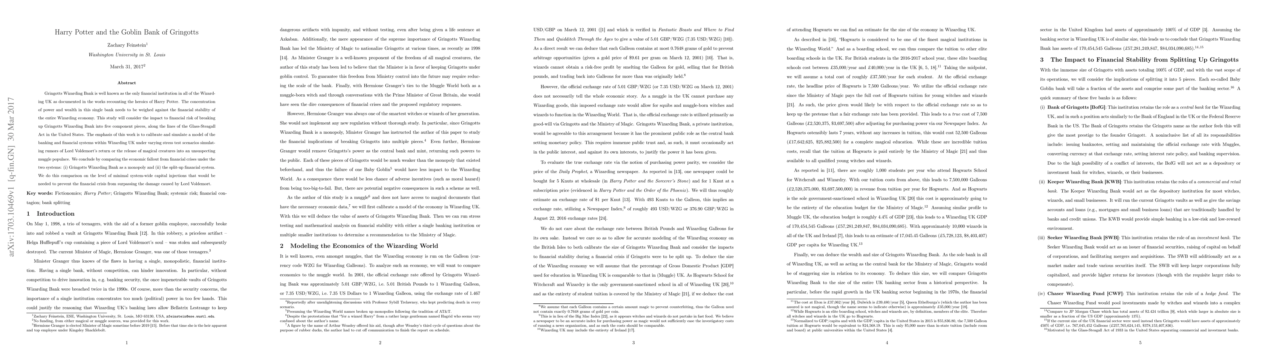 Gringotts Wizarding Bank is well known as the only financial institution in all of the Wizarding UK as documented in the works recounting the heroics of Harry Potter. The concentration of power and wealth in this single bank needs to be weighed against the financial stability of the entire Wizarding economy. This study will consider the impact to financial risk of breaking up Gringotts Wizarding Bank into five component pieces, along the lines of the Glass-Steagall Act in the United States. The emphasis of this work is to calibrate and simulate a model of the banking and financial systems within Wizarding UK under varying stress test scenarios simulating rumors of Lord Voldemort's return or the release of magical creatures into an unsuspecting muggle populace. We conclude by comparing the economic fallout from financial crises under the two systems: (i) Gringotts Wizarding Bank as a monopoly and (ii) the split-up financial system. We do this comparison on the level of minimal system-wide capital injections that would be needed to prevent the financial crisis from surpassing the damage caused by Lord Voldemort.
