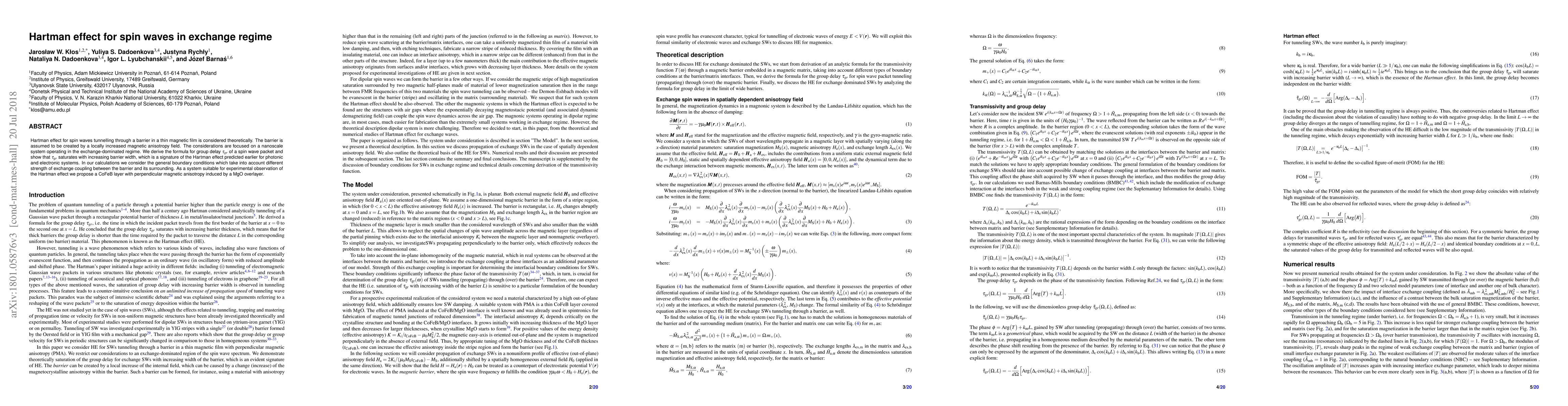 This paper theoretically investigates the Hartman effect for spin waves tunneling through a magnetic anisotropy barrier in an exchange-dominated nanoscale magnetic film, deriving a formula for the group delay saturation with barrier width. The proposed CoFeB layer with a MgO overlayer is suggested for experimental observation.