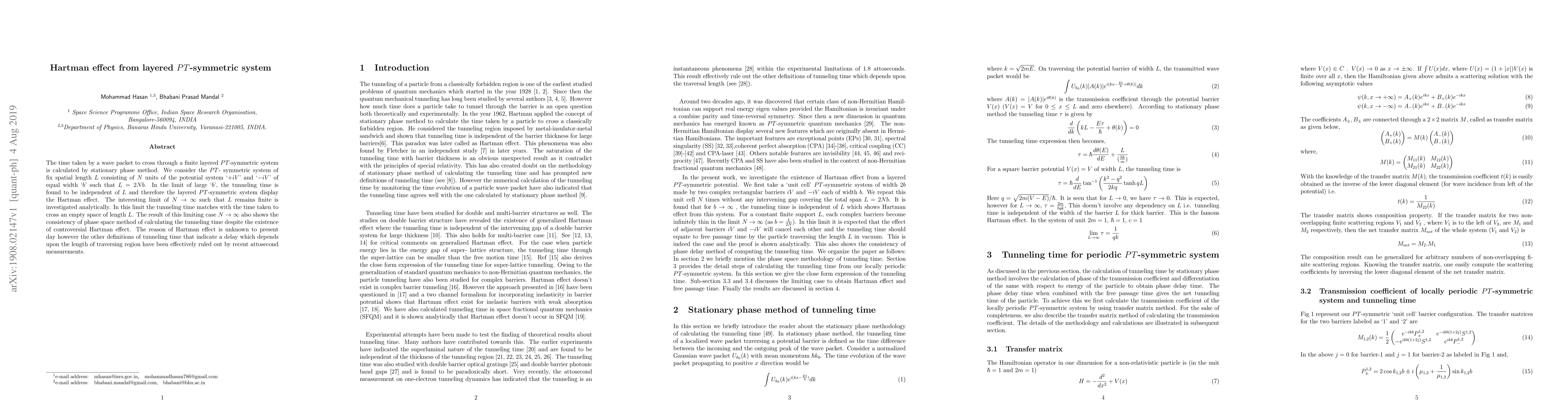 The time taken by a wave packet to cross through a finite layered $PT$-symmetric system is calculated by stationary phase method. We consider the $PT$- symmetric system of fix spatial length $L$ consisting of $N$ units of the potential system `$+iV$' and `$-iV$' of equal width `$b$' such that $L=2Nb$. In the limit of large `$b$', the tunneling time is found to be independent of $L$ and therefore the layered $PT$-symmetric system display the Hartman effect. The interesting limit of $N \rightarrow \infty$ such that $L$ remains finite is investigated analytically. In this limit the tunneling time matches with the time taken to cross an empty space of length $L$. The result of this limiting case $N \rightarrow \infty$ also shows the consistency of phase space method of calculating the tunneling time despite the existence of controversial Hartman effect. The reason of Hartman effect is unknown to present day however the other definitions of tunneling time that indicate a delay which depends upon the length of traversing region have been effectively ruled out by recent attosecond measurements.