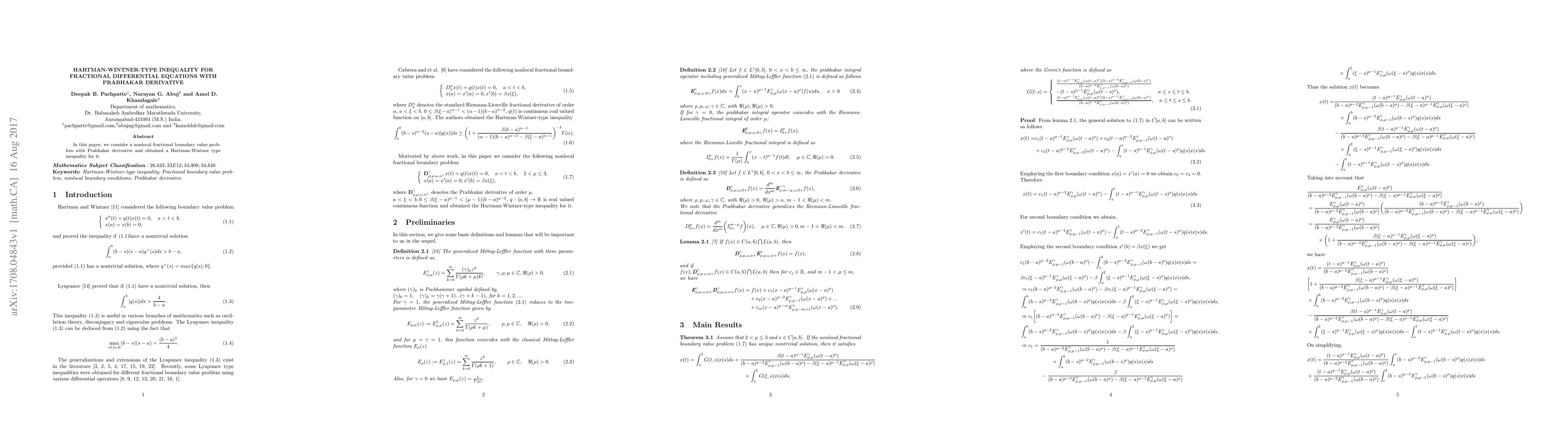 Summary: This paper investigates a nonlocal fractional boundary value problem involving the Prabhakar derivative and establishes a Hartman-Wintner-type inequality for the problem. The results provide new insights into the behavior of solutions to such fractional differential equations.