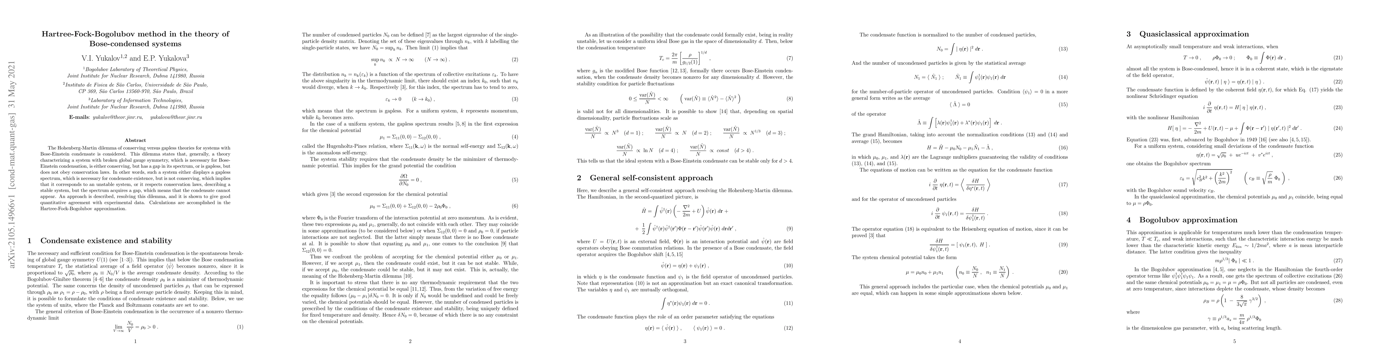 The paper addresses the Hohenberg-Martin dilemma regarding conserving versus gapless theories for Bose-Einstein condensates, proposing a solution using the Hartree-Fock-Bogolubov method that resolves the dilemma and aligns well with experimental data. The calculations demonstrate the method's effectiveness in describing stable systems without gaps in the spectrum.