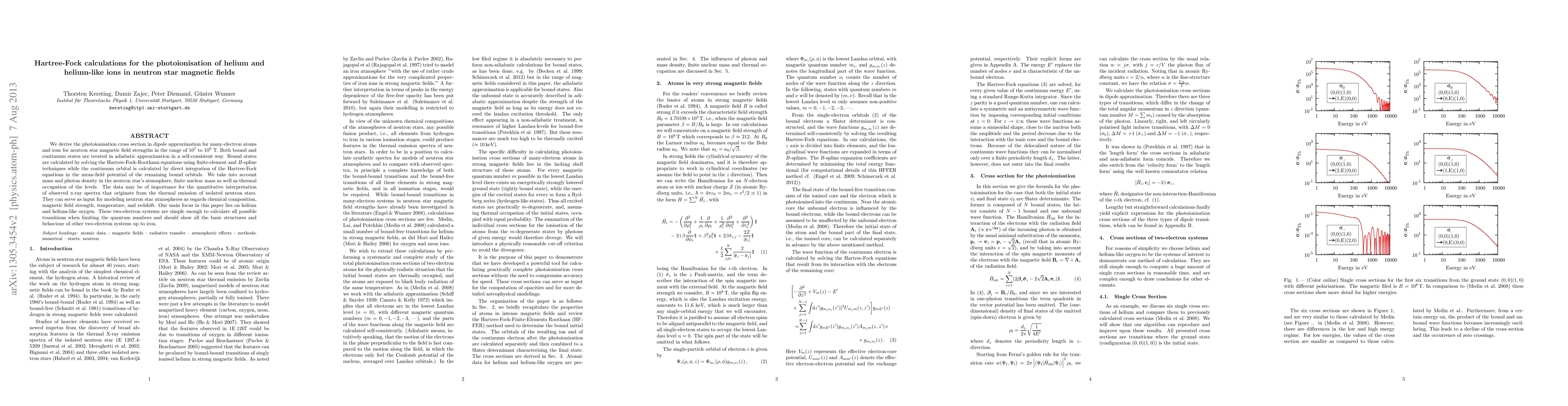 We derive the photoionisation cross section in dipole approximation for many-electron atoms and ions for neutron star magnetic field strengths in the range of 10^7 to 10^9 T. Both bound and continuum states are treated in adiabatic approximation in a self-consistent way. Bound states are calculated by solving the Hartree-Fock-Roothaan equations using finite-element and B-spline techniques while the continuum orbital is calculated by direct integration of the Hartree-Fock equations in the mean-field potential of the remaining bound orbitals. We take into account mass and photon density in the neutron star's atmosphere, finite nuclear mass as well as thermal occupation of the levels. The data may be of importance for the quantitative interpretation of observed x-ray spectra that originate from the thermal emission of isolated neutron stars. They can serve as input for modeling neutron star atmospheres as regards chemical composition, magnetic field strength, temperature, and redshift. Our main focus in this paper lies on helium and helium-like oxygen. These two-electron systems are simple enough to calculate all possible transitions when limiting the quantum numbers and should show all the basic structures and behaviour of other two-electron systems up to iron.