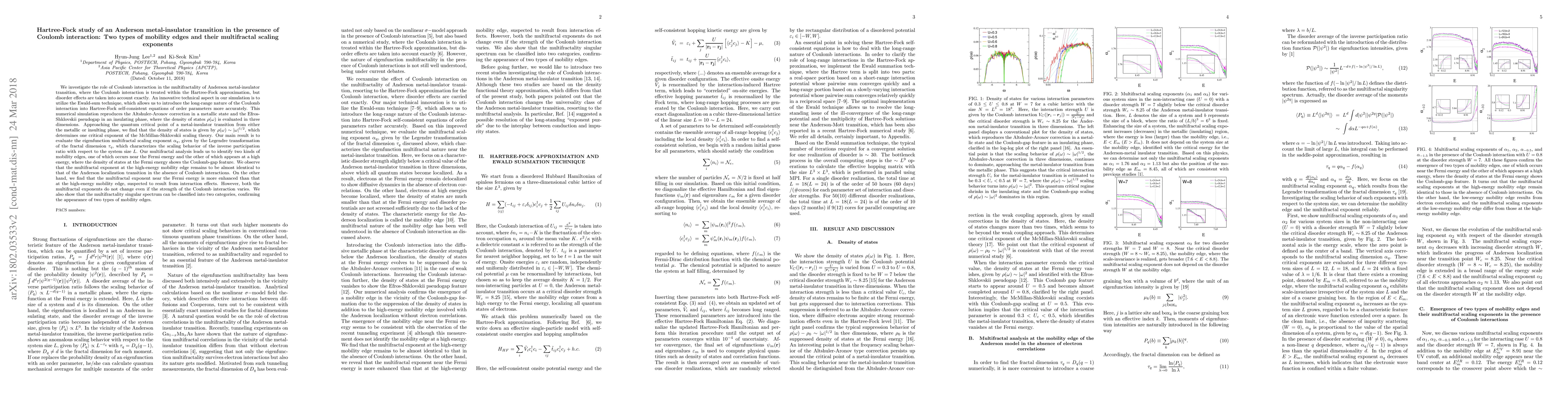 In summary, we investigated the role of Coulomb interactions in the nature of eigenfunction multifractality of an Anderson metal-insulator transition, based on the Hartree-Fock approximation and the Ewald summation technique. As a result, we showed that two types of mobility edges appear near the Fermi energy and at a high energy, respectively, where the low-energy mobility edge results from Coulomb interactions while the high-energy one is nothing but the mobility edge of the Anderson localization transition without electron correlations. Indeed, not only multifractal scaling exponents but also the multifractal singularity spectrum confirms the existence of two kinds of mobility edges: Their values differ from those of the Anderson metal-insulator transition and the singularity spectrum collapses into two types of curves, implying two kinds of scale-invariance, which depends on the energy scale. We speculate that this novel nature of the eigenfunction multifractality would serve as valuable information for possible instabilities near a metal-insulator transition in the presence of Coulomb interactions.