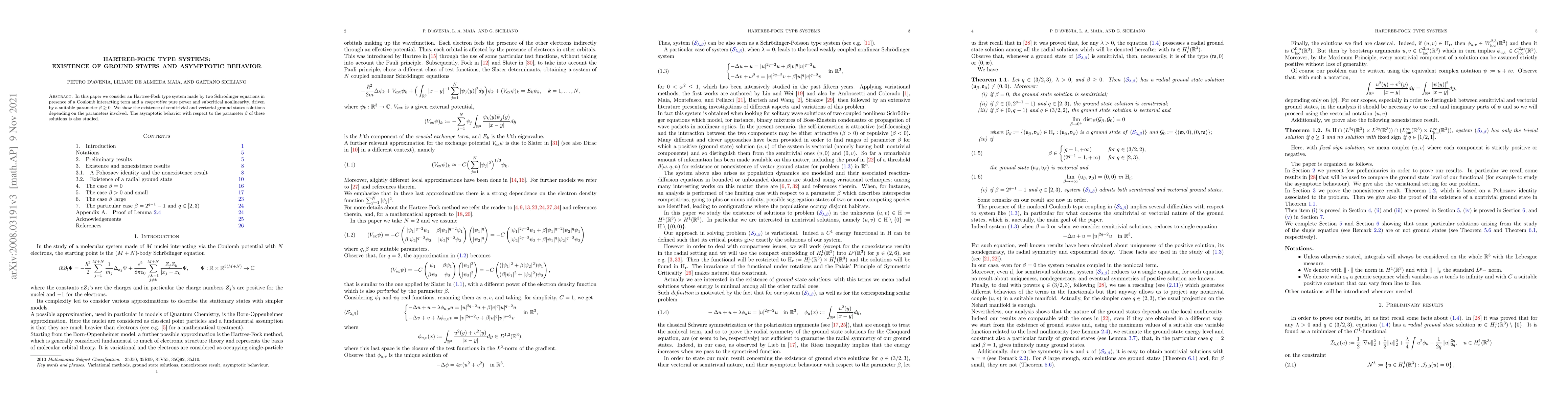 This paper investigates Hartree-Fock type systems with semitrivial and vectorial ground states solutions that exist depending on parameters, exhibiting asymptotic behavior with respect to a key parameter beta.