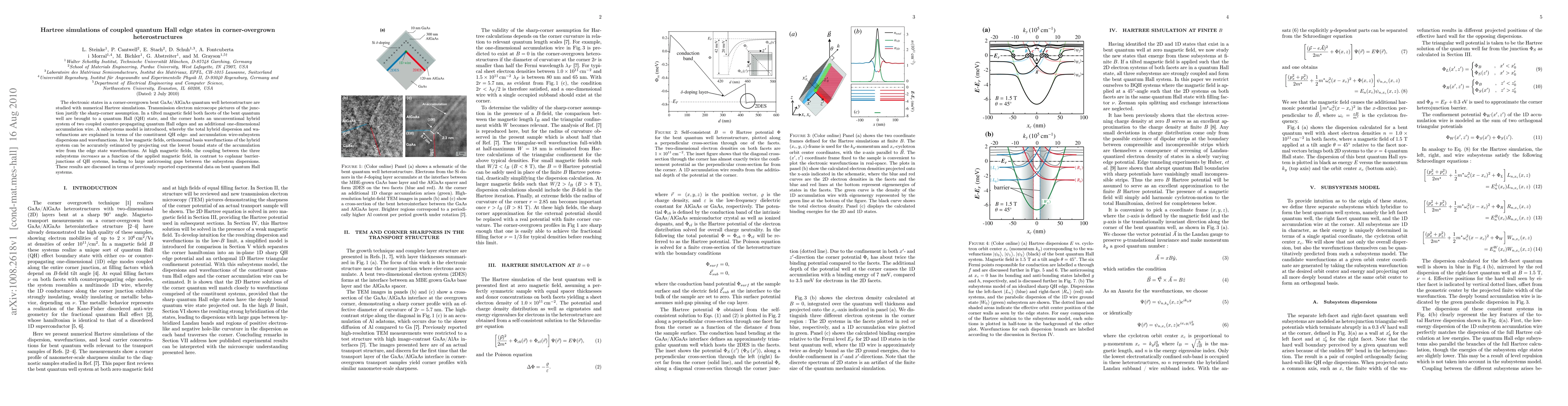 The electronic states in a corner-overgrown bent GaAs/AlGaAs quantum well heterostructure are studied with numerical Hartree simulations. Transmission electron microscope pictures of the junction justify the sharp-corner assumption. In a tilted magnetic field both facets of the bent quantum well are brought to a quantum Hall (QH) state, and the corner hosts an unconventional hybrid system of two coupled counter-propagating quantum Hall edges and an additional one-dimensional accumulation wire. A subsystems model is introduced, whereby the total hybrid dispersion and wavefunctions are explained in terms of the constituent QH edge- and accumulation wire-subsystem dispersions and wavefunctions. At low magnetic fields, orthonormal basis wavefunctions of the hybrid system can be accurately estimated by projecting out the lowest bound state of the accumulation wire from the edge state wavefunctions. At high magnetic fields, the coupling between the three subsystems increases as a function of the applied magnetic field, in contrast to coplanar barrier-junctions of QH systems, leading to large anticrossing gaps between the subsystem dispersions. These results are discussed in terms of previously reported experimental data on bent quantum Hall systems.