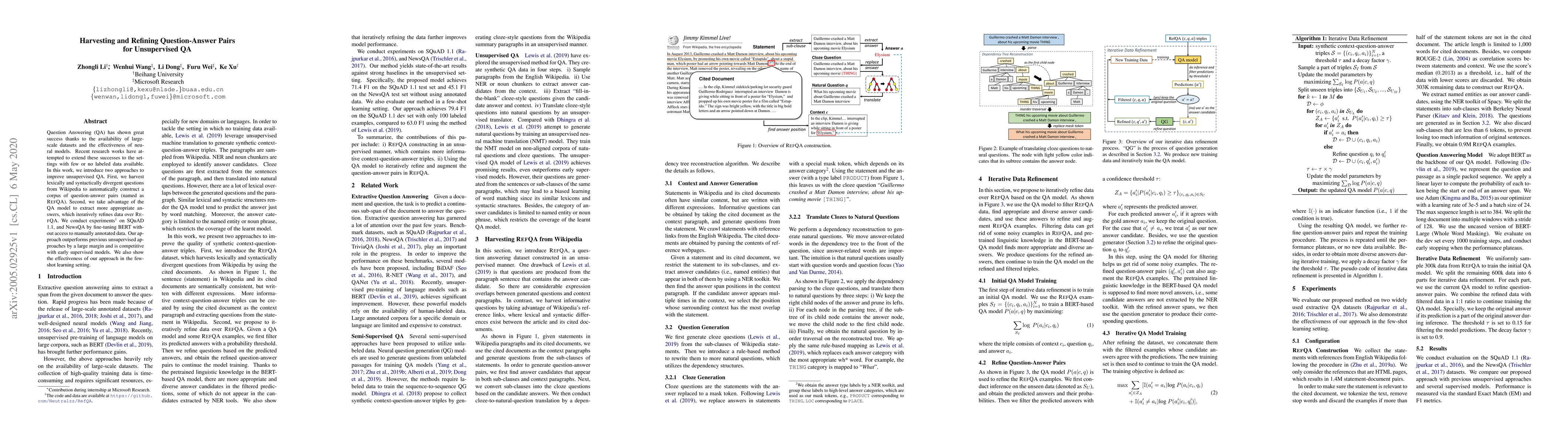 Question Answering (QA) has shown great success thanks to the availability of large-scale datasets and the effectiveness of neural models. Recent research works have attempted to extend these successes to the settings with few or no labeled data available. In this work, we introduce two approaches to improve unsupervised QA. First, we harvest lexically and syntactically divergent questions from Wikipedia to automatically construct a corpus of question-answer pairs (named as RefQA). Second, we take advantage of the QA model to extract more appropriate answers, which iteratively refines data over RefQA. We conduct experiments on SQuAD 1.1, and NewsQA by fine-tuning BERT without access to manually annotated data. Our approach outperforms previous unsupervised approaches by a large margin and is competitive with early supervised models. We also show the effectiveness of our approach in the few-shot learning setting.