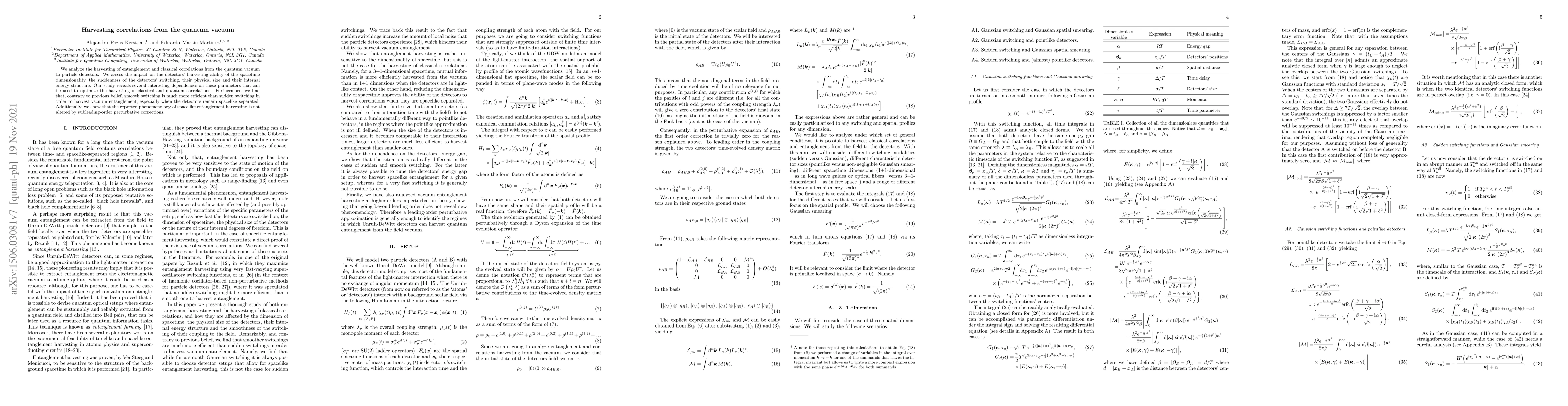 This paper investigates how entanglement and classical correlations from the quantum vacuum can be harvested by particle detectors, finding that smooth switching is more efficient than sudden switching. It also explores the impact of spacetime dimensionality, detector size, and internal energy structure on harvesting efficiency.
