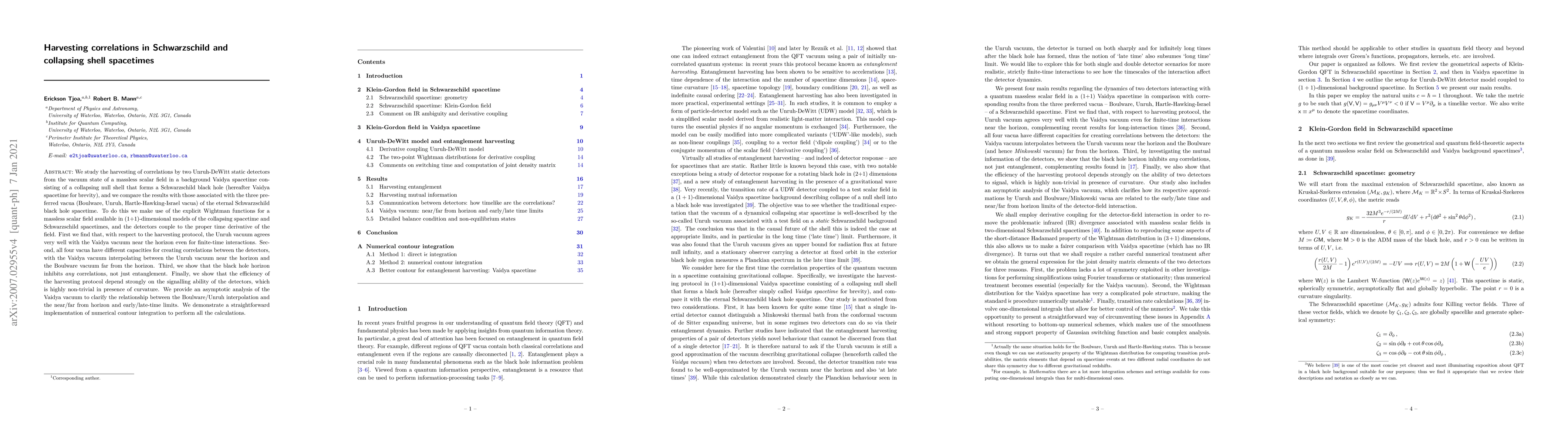 Researchers studied the correlations created by detectors in vacuum states of a massless scalar field in different spacetimes, including Schwarzschild black holes and collapsing shell spacetimes, finding that the harvesting protocol can create correlations even near the horizon.