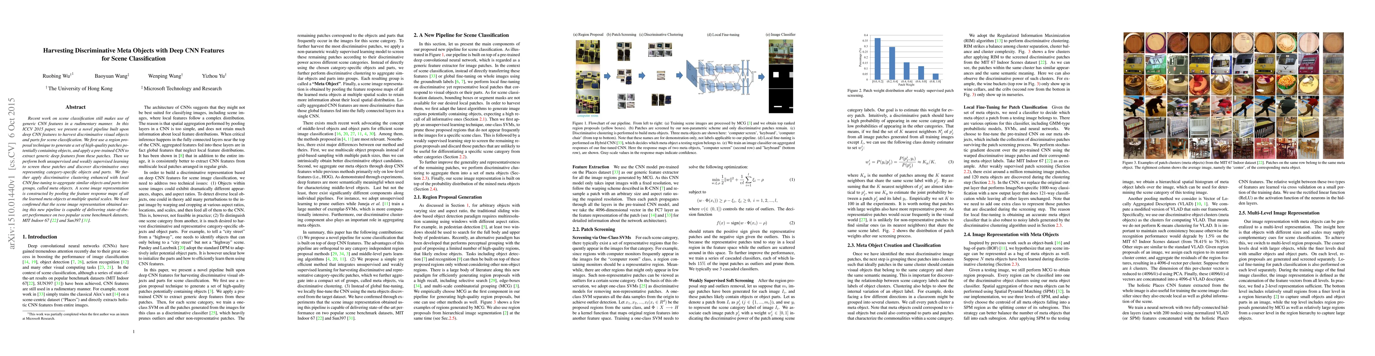 This paper proposes a novel pipeline using deep CNN features to extract discriminative meta objects and parts for scene classification, achieving state-of-the-art performance on MIT Indoor 67 and Sun397 datasets. It employs region proposal, unsupervised learning, and discriminative clustering to identify and aggregate category-specific objects.