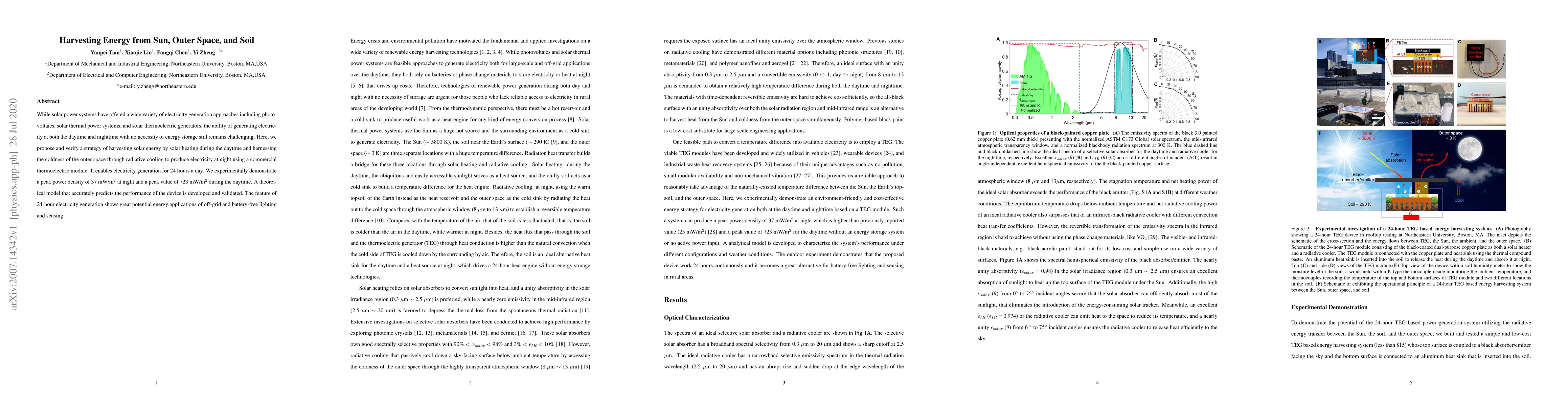While solar power systems have offered a wide variety of electricity generation approaches including photovoltaics, solar thermal power systems, and solar thermoelectric generators, the ability of generating electricity at both the daytime and nighttime with no necessity of energy storage still remains challenging. Here, we propose and verify a strategy of harvesting solar energy by solar heating during the daytime and harnessing the coldness of the outer space through radiative cooling to produce electricity at night using a commercial thermoelectric module. It enables electricity generation for 24 hours a day. We experimentally demonstrate a peak power density of 37 mW/m2 at night and a peak value of 723 mW/m2 during the daytime. A theoretical model that accurately predicts the performance of the device is developed and validated. The feature of 24-hour electricity generation shows great potential energy applications of off-grid and battery-free lighting and sensing.