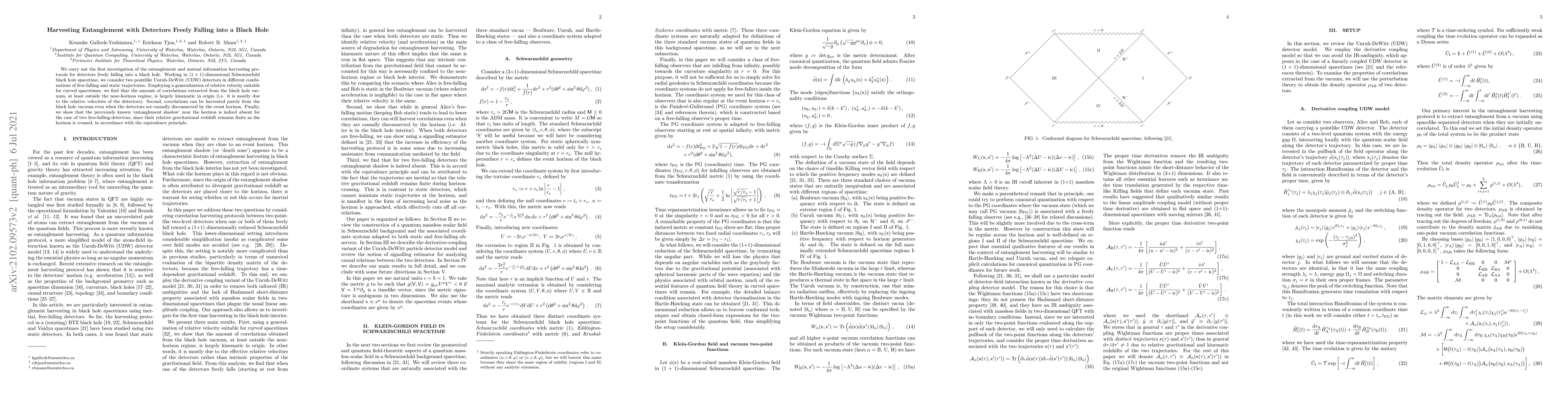 We carry out the first investigation of the entanglement and mutual information harvesting protocols for detectors freely falling into a black hole. Working in $(1+1)$-dimensional Schwarzschild black hole spacetime, we consider two pointlike Unruh-DeWitt (UDW) detectors in different combinations of free-falling and static trajectories. Employing a generalization of relative velocity suitable for curved spacetimes, we find that the amount of correlations extracted from the black hole vacuum, at least outside the near-horizon regime, is largely kinematic in origin (i.e. it is mostly due to the relative velocities of the detectors). Second, correlations can be harvested purely from the black hole vacuum even when the detectors are causally disconnected by the event horizon. Finally, we show that the previously known `entanglement shadow' near the horizon is indeed absent for the case of two free-falling-detectors, since their relative gravitational redshift remains finite as the horizon is crossed, in accordance with the equivalence principle.