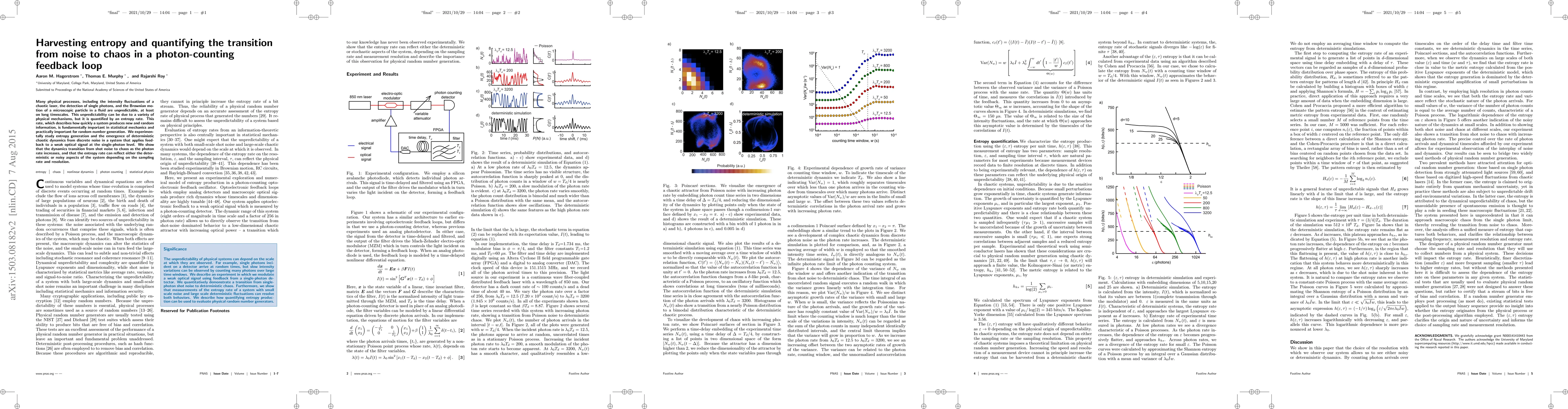 This paper investigates entropy generation and the transition from noise to chaos in a photon-counting feedback loop, demonstrating how the dynamics shift from shot noise to chaos as photon rate increases. The study highlights that the entropy rate can reflect both deterministic and noisy aspects of the system, depending on sampling rate and resolution.