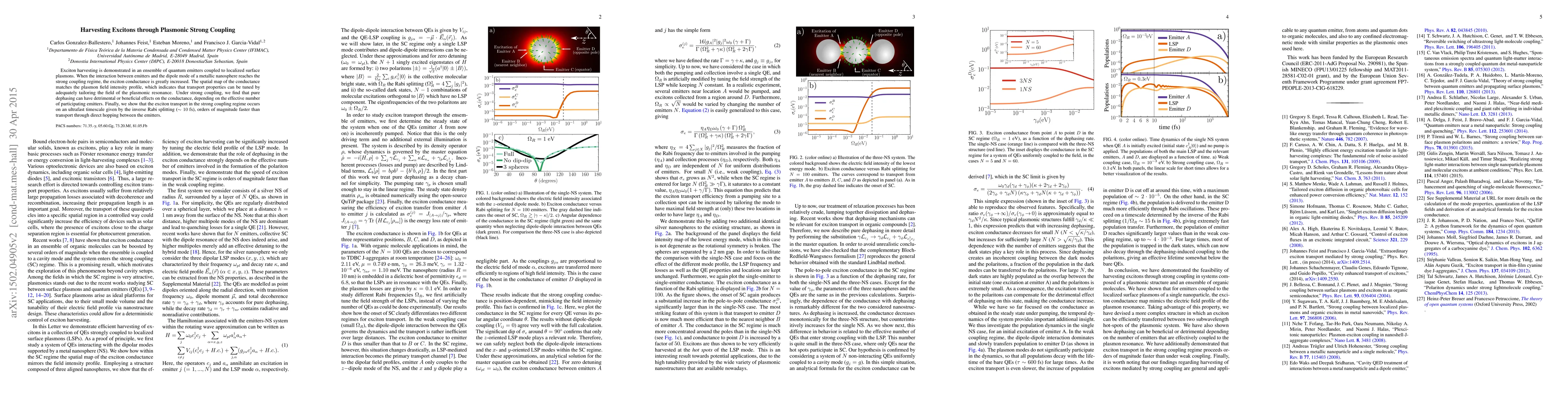 This study demonstrates exciton harvesting in quantum emitters coupled to localized surface plasmons, showing that strong coupling enhances exciton conductance and enables tuning of transport properties via plasmonic resonance field tailoring. The research reveals that the ultrafast exciton transport in strong coupling occurs on a femtosecond timescale, significantly faster than direct emitter hopping.