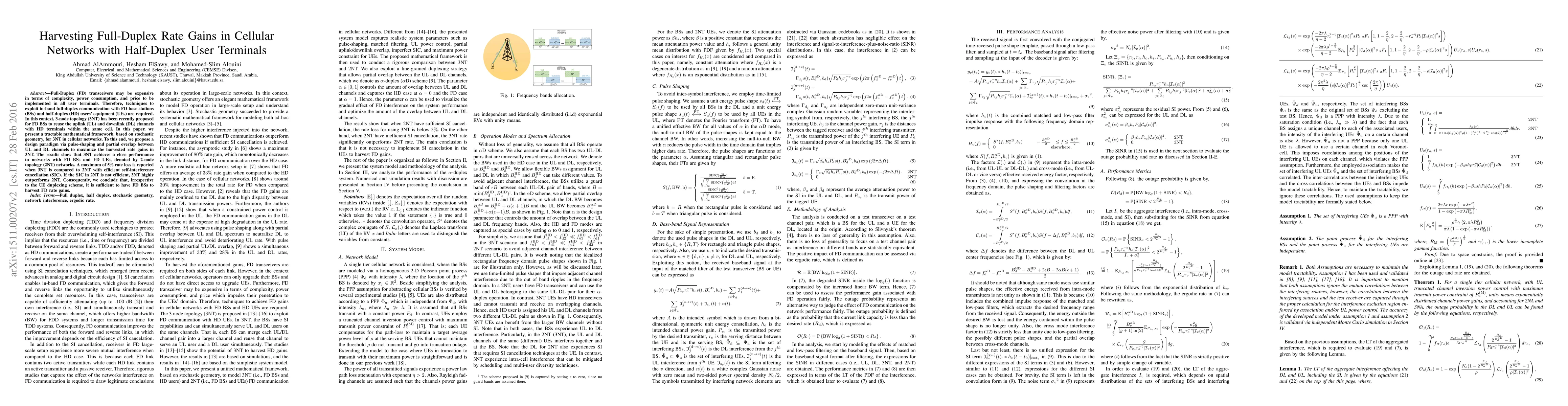 Full-Duplex (FD) transceivers may be expensive in terms of complexity, power consumption, and price to be implemented in all user terminals. Therefore, techniques to exploit in-band full-duplex communication with FD base stations (BSs) and half-duplex (HD) users' equipment (UEs) are required. In this context, 3-node topology (3NT) has been recently proposed for FD BSs to reuse the uplink (UL) and downlink (DL) channels with HD terminals within the same cell. In this paper, we present a tractable mathematical framework, based on stochastic geometry, for 3NT in cellular networks. To this end, we propose a design paradigm via pulse-shaping and partial overlap between UL and DL channels to maximize the harvested rate gains in 3NT. The results show that 3NT achieves a close performance to networks with FD BSs and FD UEs, denoted by 2-node topology (2NT) networks. A maximum of 5$\%$ rate loss is reported when 3NT is compared to 2NT with efficient self-interference cancellation (SIC). If the SIC in 2NT is not efficient, 3NT highly outperforms 2NT. Consequently, we conclude that, irrespective to the UE duplexing scheme, it is sufficient to have FD BSs to harvest FD rate gains.