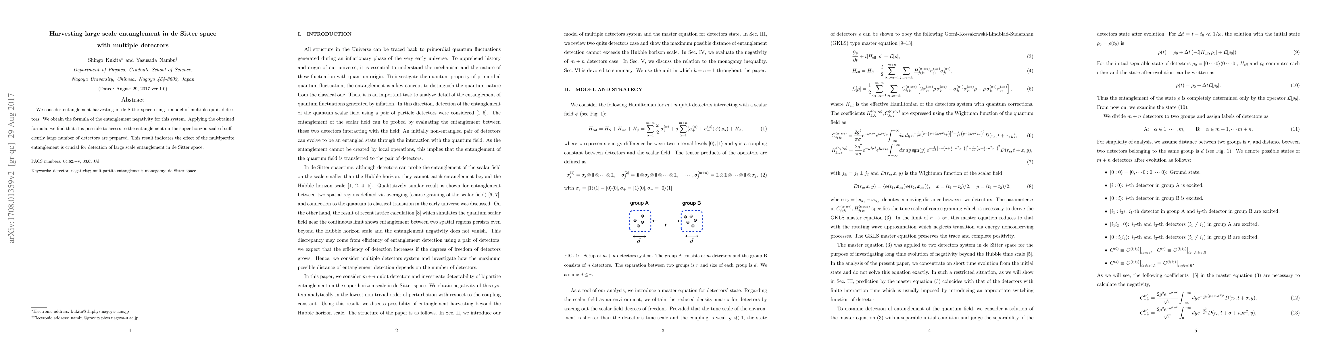 This paper explores entanglement harvesting in de Sitter space with multiple qubit detectors, deriving a formula for entanglement negativity. It concludes that a sufficiently large number of detectors can access super horizon scale entanglement, highlighting the importance of multipartite entanglement for detecting such large-scale entanglement.