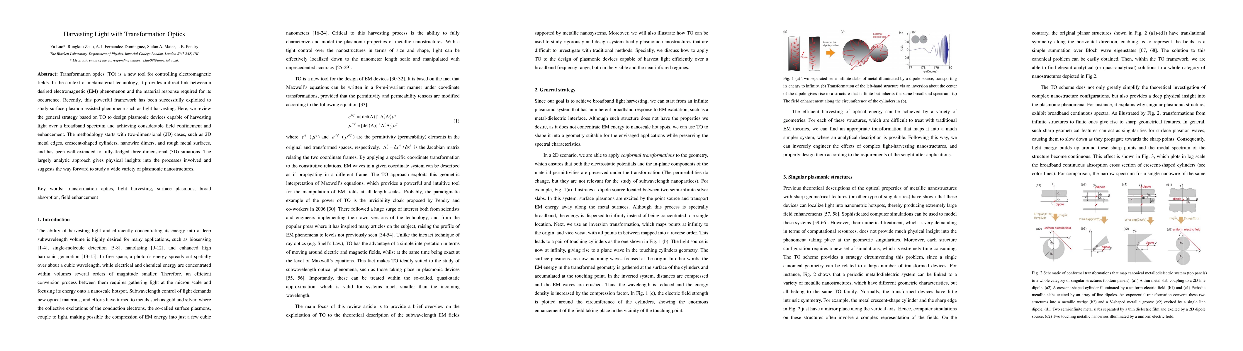 Transformation optics (TO) is a new tool for controlling electromagnetic fields. In the context of metamaterial technology, it provides a direct link between a desired electromagnetic (EM) phenomenon and the material response required for its occurrence. Recently, this powerful framework has been successfully exploited to study surface plasmon assisted phenomena such as light harvesting. Here, we review the general strategy based on TO to design plasmonic devices capable of harvesting light over a broadband spectrum and achieving considerable field confinement and enhancement. The methodology starts with two-dimensional (2D) cases, such as 2D metal edges, crescent-shaped cylinders, nanowire dimers, and rough metal surfaces, and has been well extended to fully-fledged three-dimensional (3D) situations. The largely analytic approach gives physical insights into the processes involved and suggests the way forward to study a wide variety of plasmonic nanostructures.